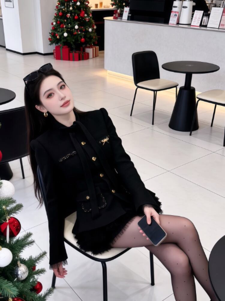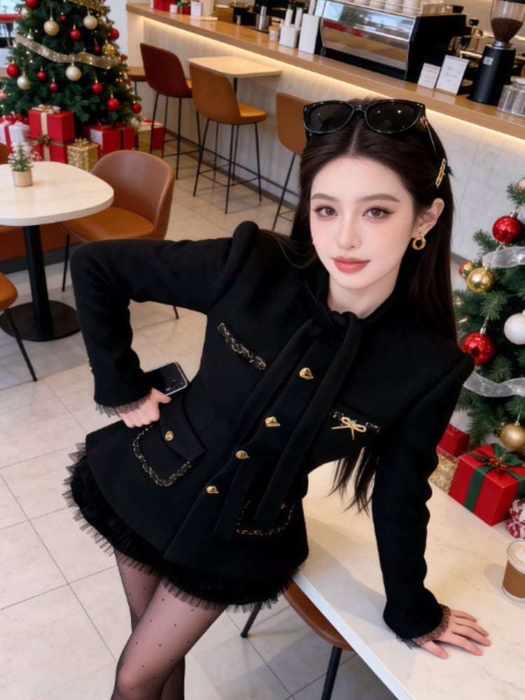 黒のジャケット+スカート【上品でリラックス感のある着こなし/シャネル風お嬢様セットアップ/韓国風ミュウミュウ風コーデ】ブローチなし