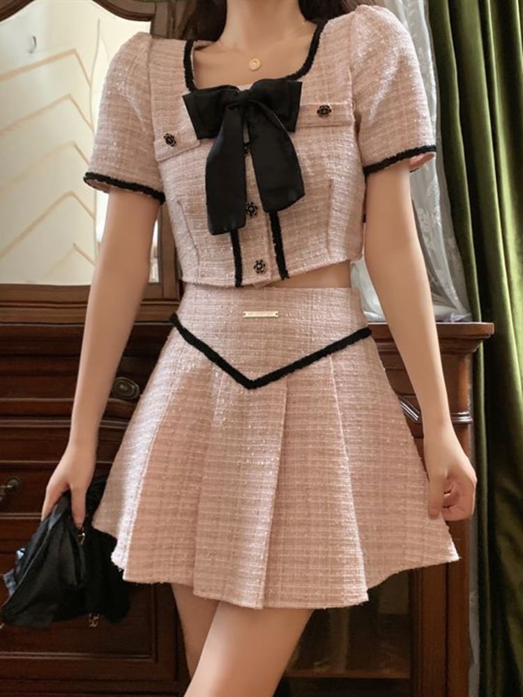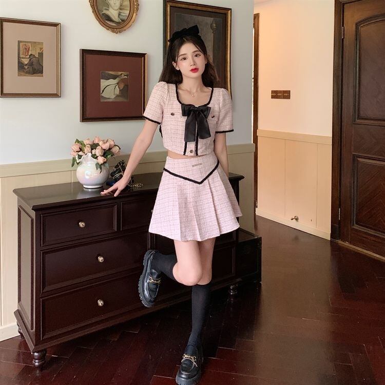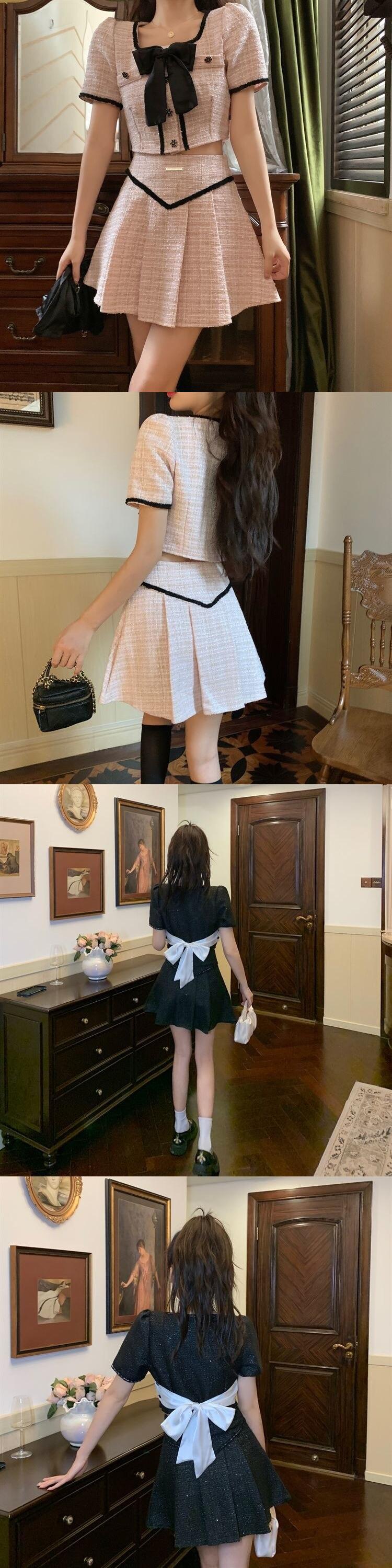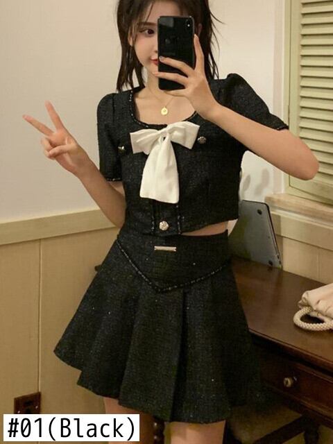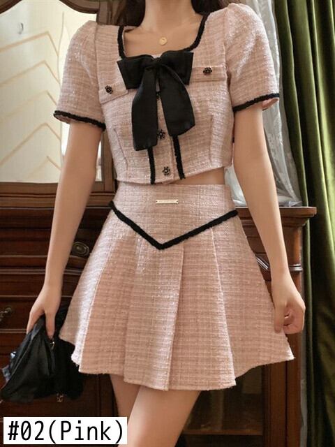 ストリート小さな香りツイード 2 点セット女性弓ショート ジャケット コート + プリーツ スカート スーツ甘い夏 2 点セット リボン 大人ガーリー スウィート キュート カジュアル サマー 夏物 mes46277320096