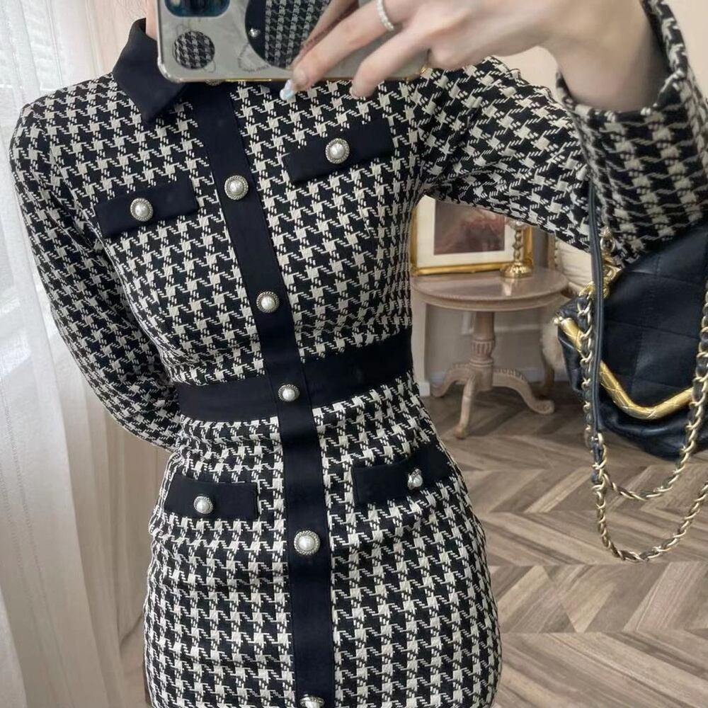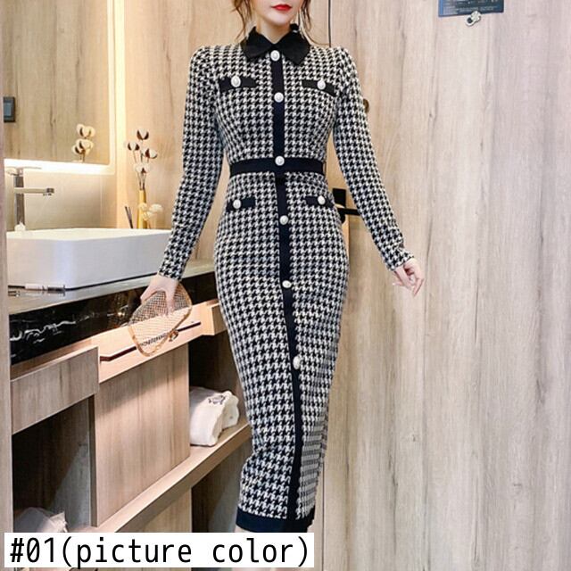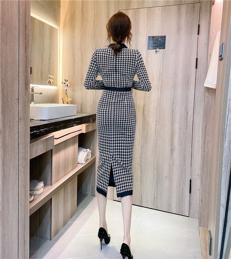 小さな香りの女性千鳥格子ニットセータードレス秋レトロローブストリート冬ボディコンチェック柄ロングドレス オータム 秋物 ウィンター 冬物 mes39816320604