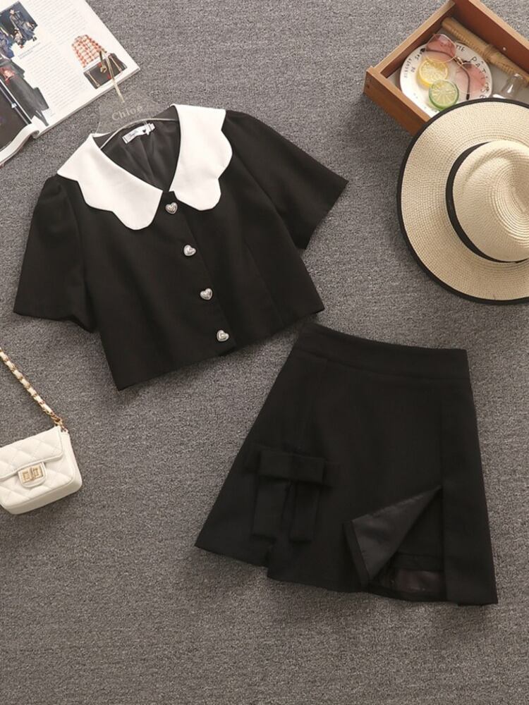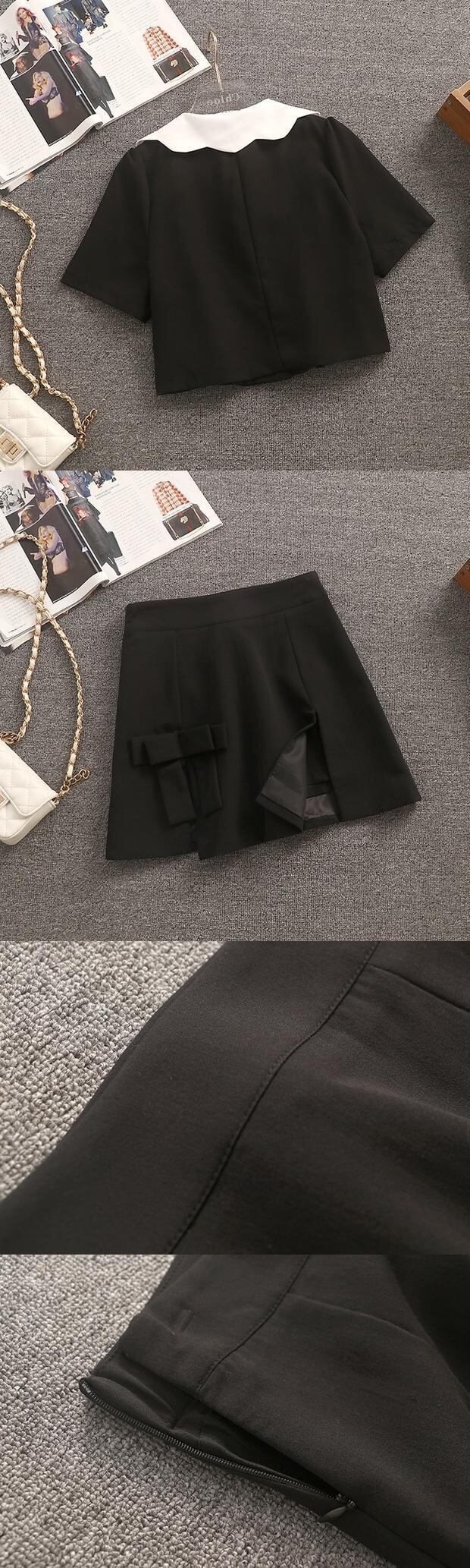 OL ツーピースセット女性ショートシャツブラウスクロップトップ + 弓スプリットショーツスーツ小さな香り夏 2 ピースパンツセット リボン サマー 夏物 ブルマー mes3286460119
