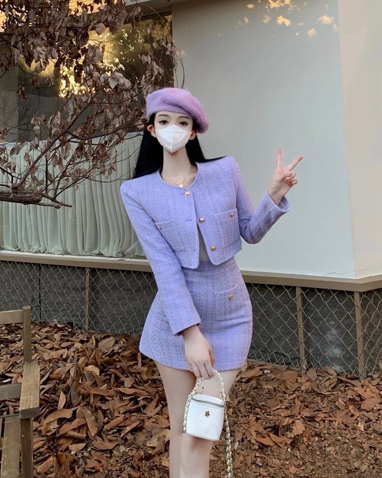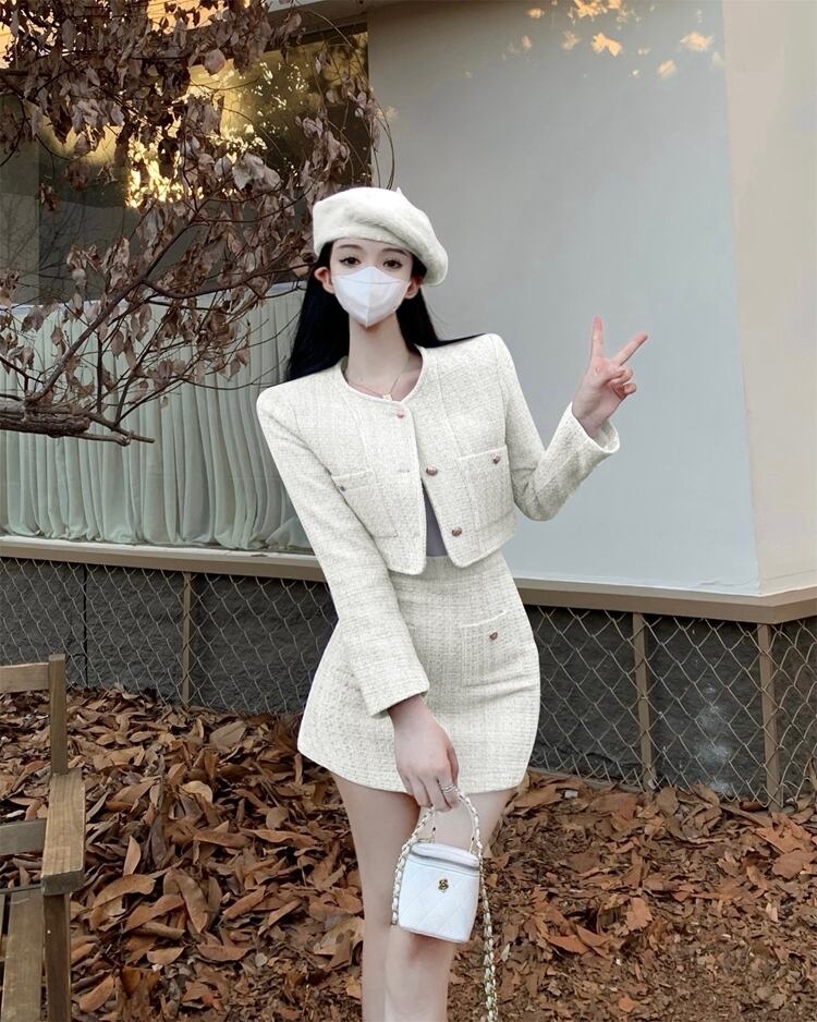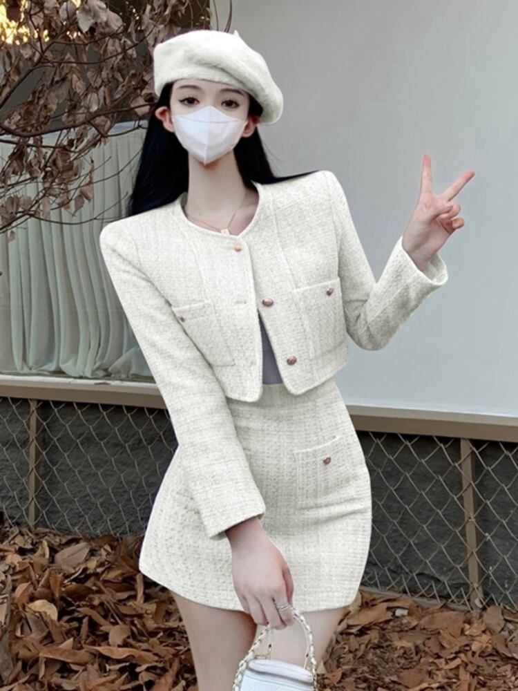 小さなフレグランス ツイード 2 点セット女性衣装甘いショート ジャケット コート + スカート ツーピース スーツ 大人ガーリー スウィート キュート カジュアル mes48011403152