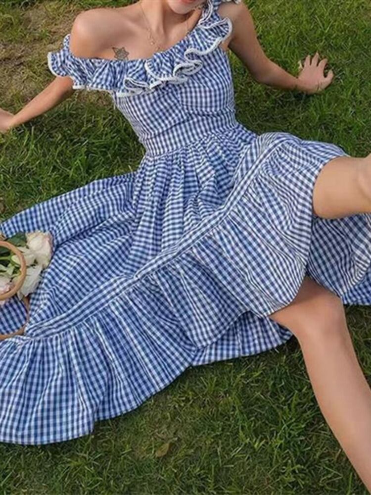 バタフライスリーブサマーロングドレス女性チェック柄自由奔放に生きるホリデードレスパーティー Vestidos 夏物 mes60081061635