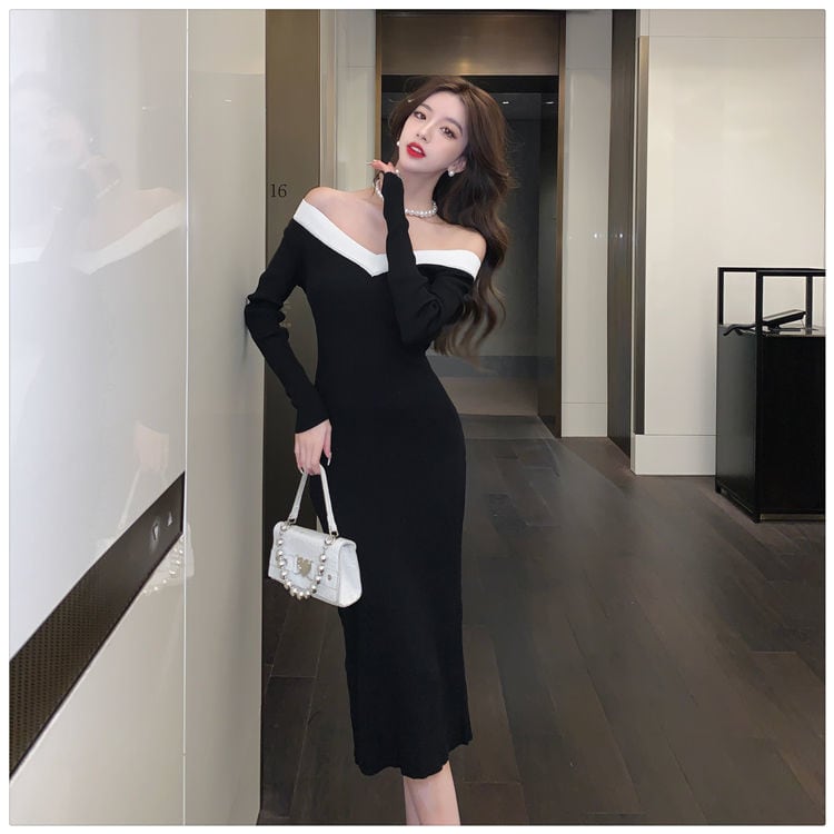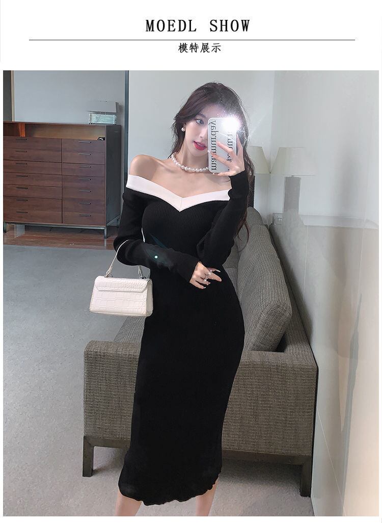 V ネック底付きニットセータードレス女性春秋スリムウエストボディコンロングドレスパーティーローブ Vestidos スプリング 春物 Vネック mes14474783697