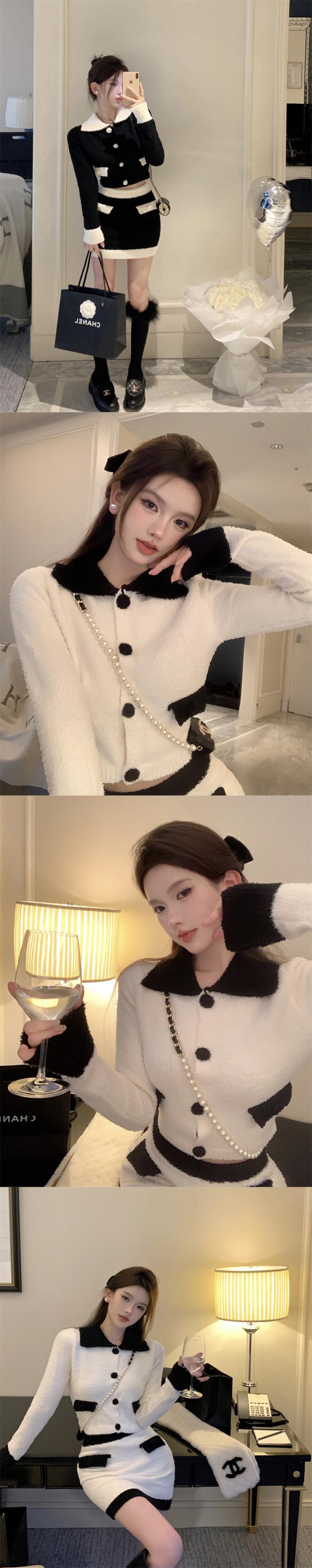 小さなフレグランス ニット スーツ女性春コントラスト カラー長袖ショート セーター カーディガン + ボディコン スカート 2 点セット ロング スプリング 春物 mes45496710419