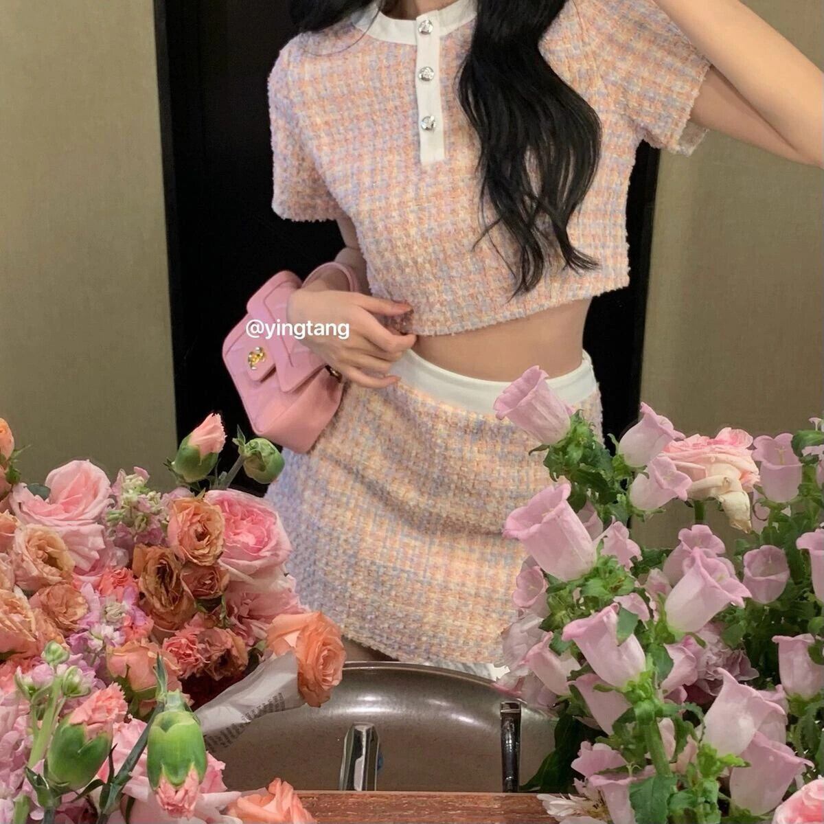 小さなフレグランス ツイード ツー ピース セット女性ショート ジャケット コート + ボディコン スカート セット甘い夏 2 ピース スーツ 大人ガーリー スウィート キュート カジュアル サマー 夏物 mes70210889710