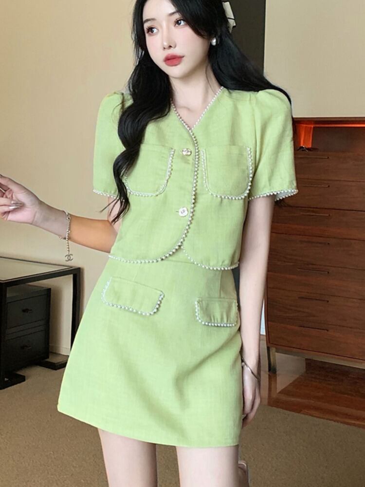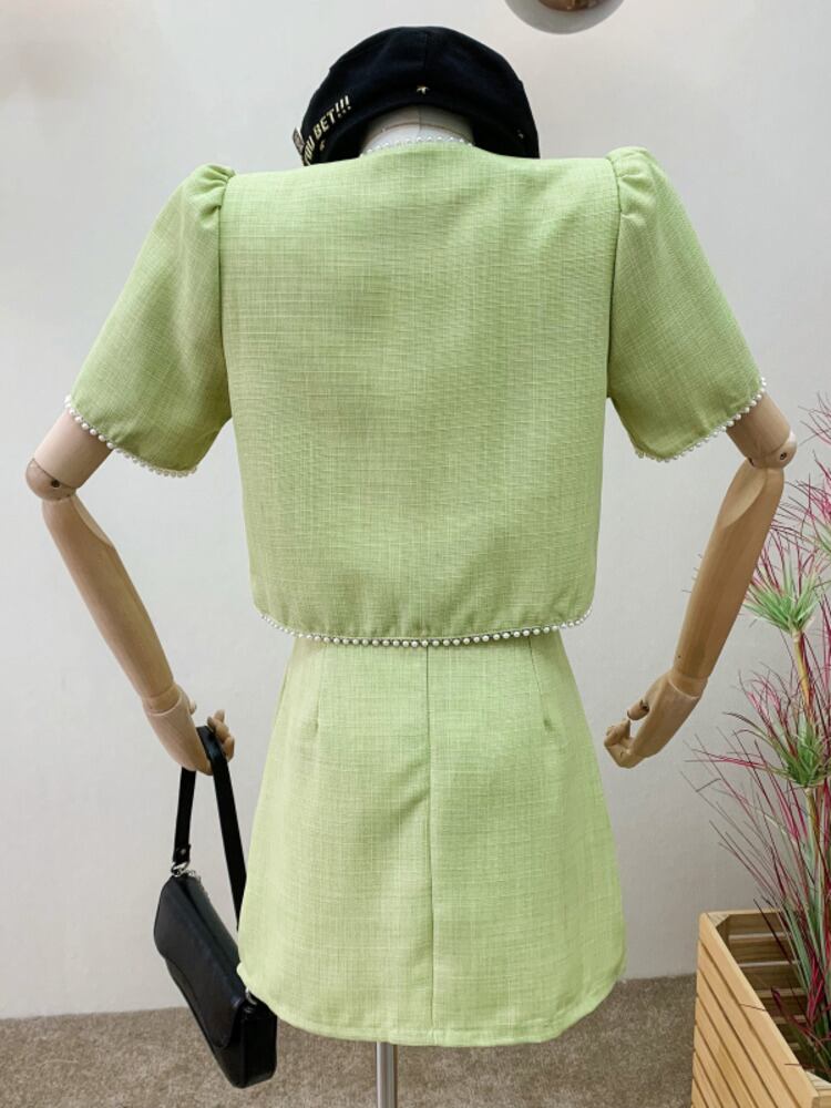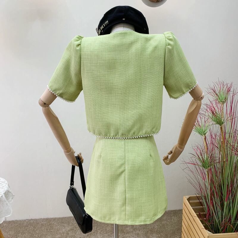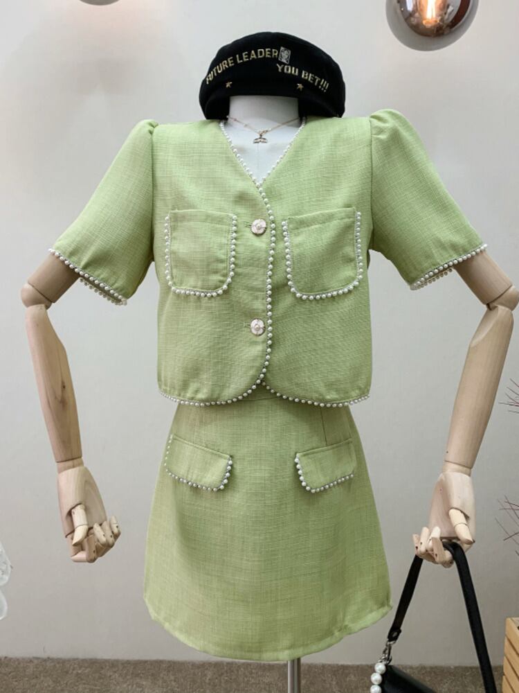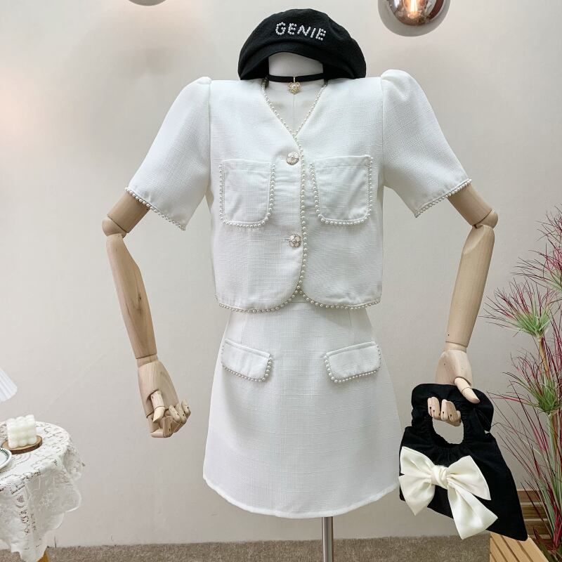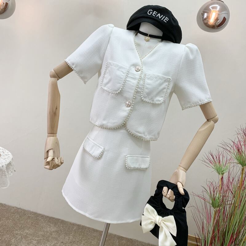 小さなフレグランス 2 点セット女性ショート ジャケット コート クロップ トップ + スカート スーツ ビーズ夏 2 点セット サマー 夏物 mes9441829747
