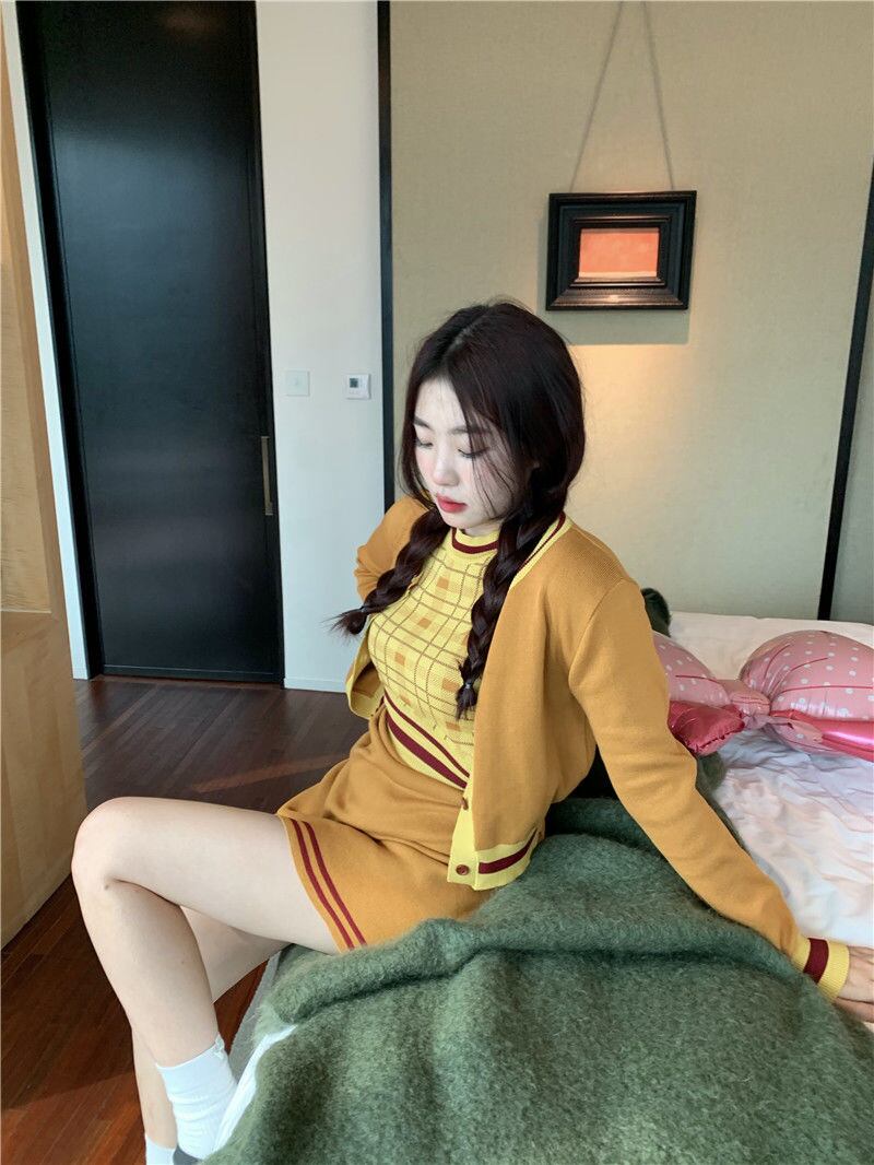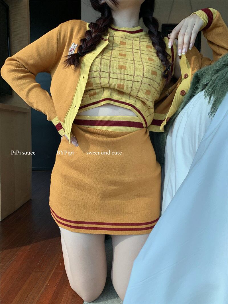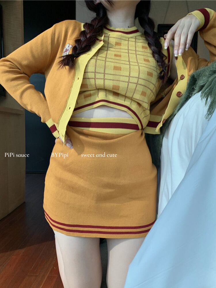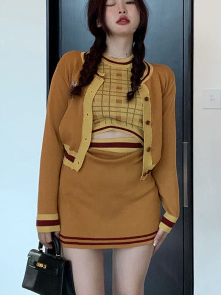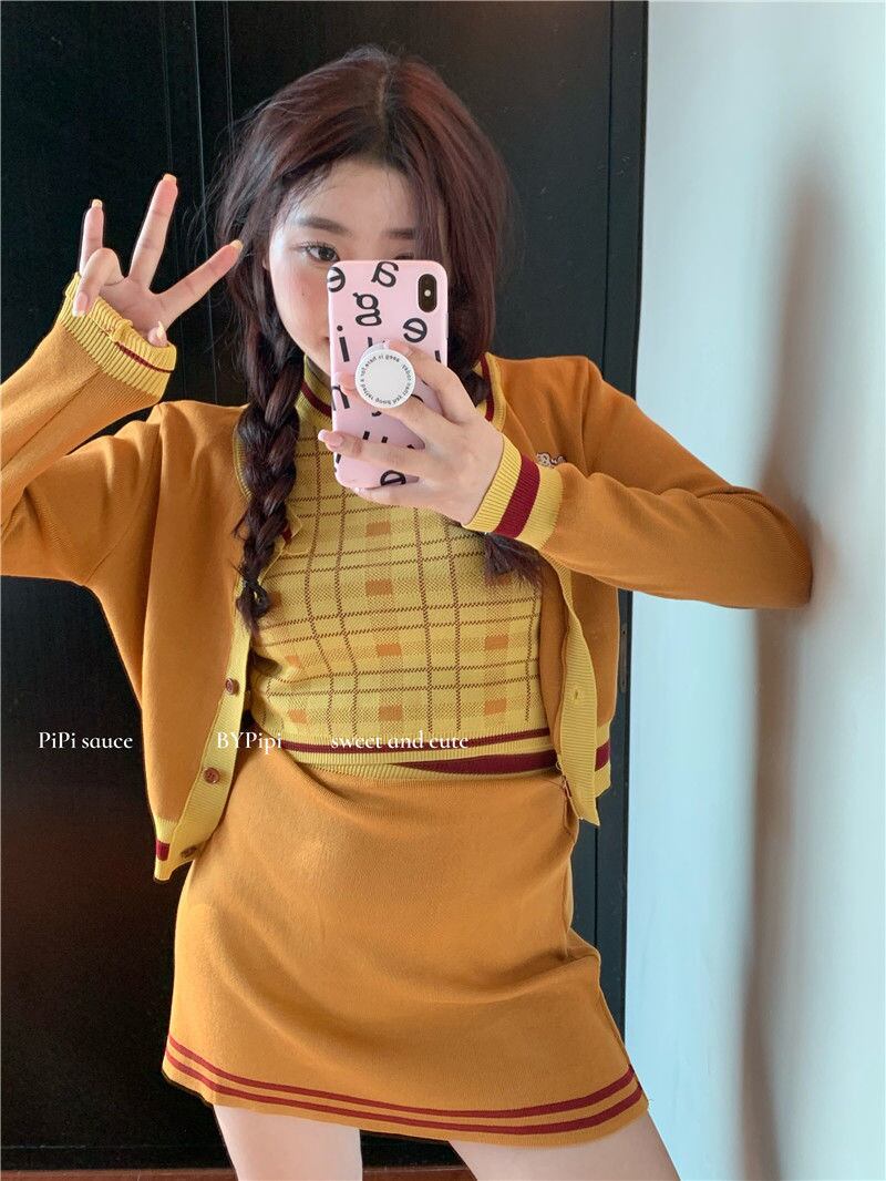 プレッピー スタイル ニット スリー ピース セット女性カーディガン + チェック柄クロップ トップ + スカート セット秋冬 3 ピース スーツ オータム 秋物 ウィンター 冬物 mes65006326286