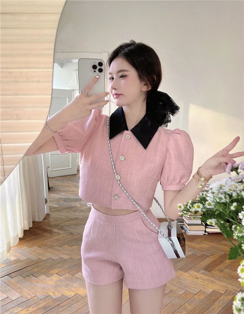 スウィートスモールフレグランスツーピースセット女性パフスリーブシャツクロップトップ + ショーツセット夏 2 ピースパンツスーツ 大人ガーリー キュート カジュアル サマー 夏物 ブルマー mes97959012553
