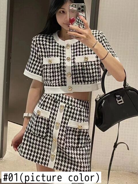 夏の千鳥格子 2 点セット女性ショート ジャケット コート + スカート セット フレンチ ツー ピース スーツ サマー 夏物 mes54556159213