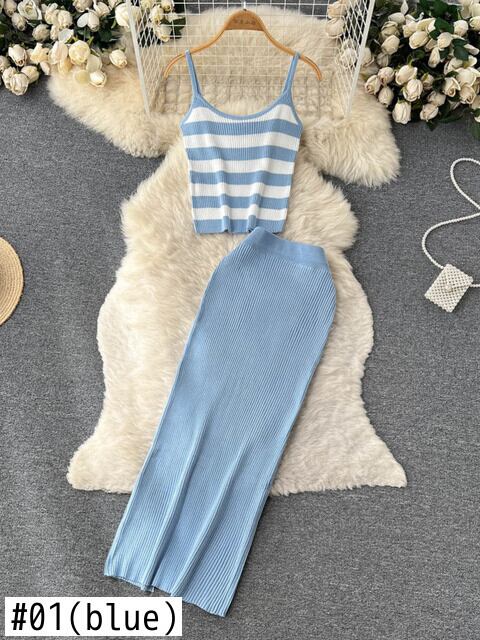 甘いストライプニットツーピースセット女性のセクシーなクロップトップ + スプリットロングスカートセット女の子ショートベスト & スカートスーツ 2 ピース衣装 大人ガーリー スウィート キュート カジュアル mes82075647112
