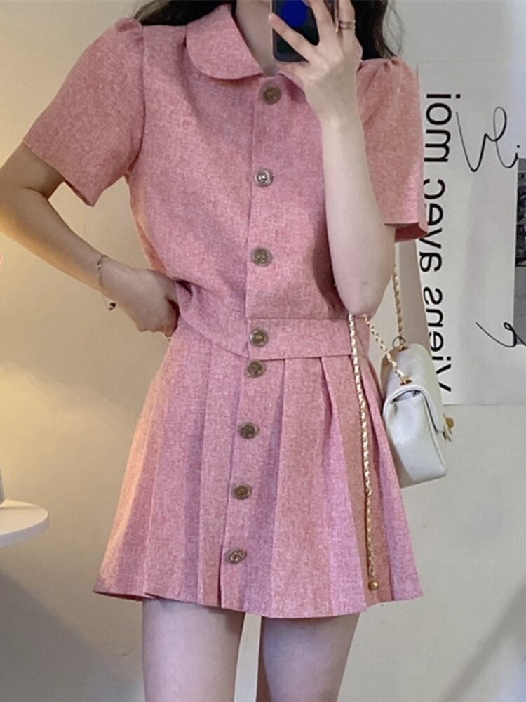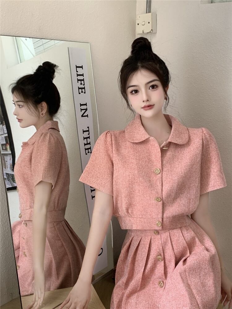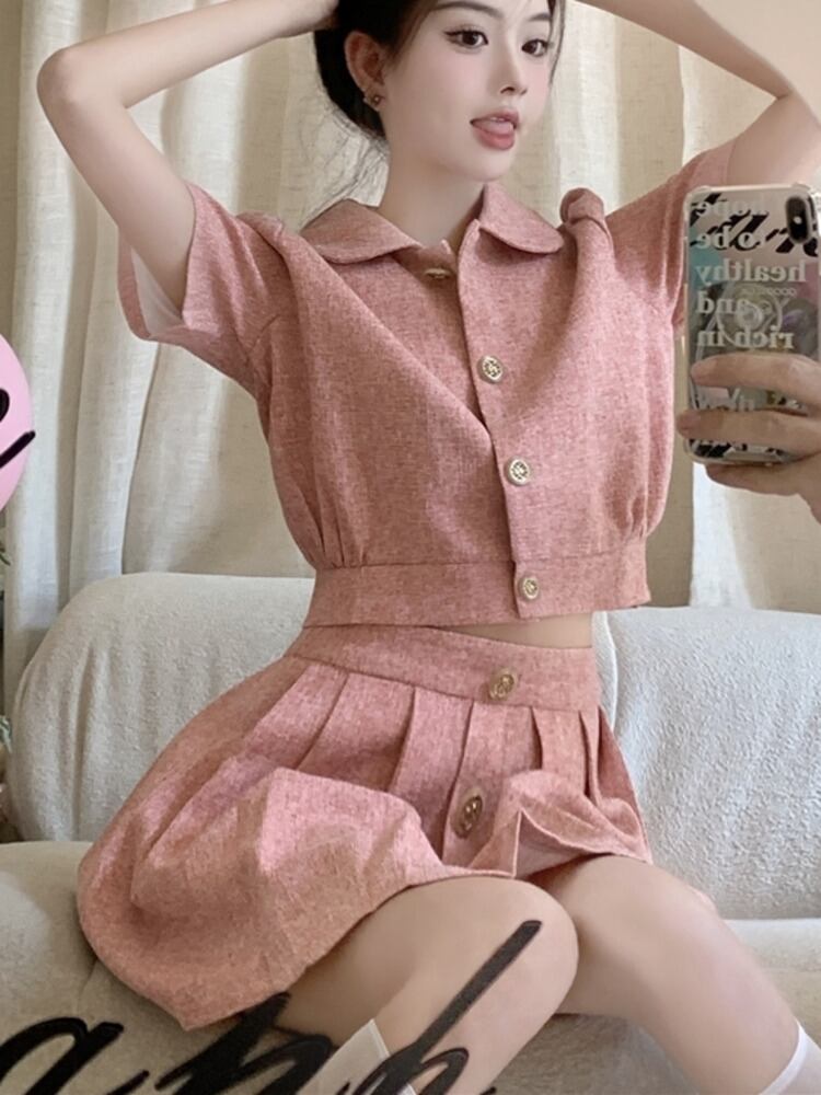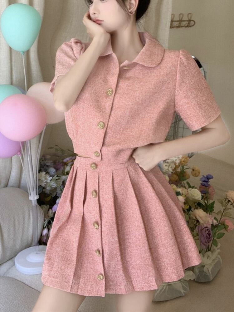 小さなフレグランス 2 点セット女性ジャケット コート クロップ トップ + プリーツ スカート スーツ夏甘い 2 点セット 大人ガーリー スウィート キュート カジュアル サマー 夏物 mes97659029549