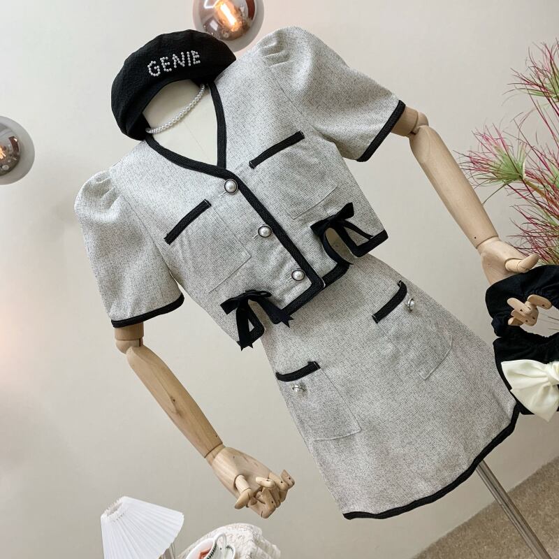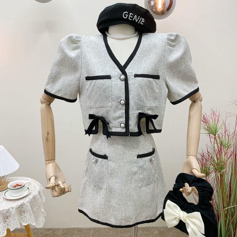 フレンチジェントルスウィートスモールフレグランスツーピースセット女性パフスリーブシャツクロップトップ + ミニスカートセット夏セットレディース衣装 大人ガーリー キュート カジュアル サマー 夏物 mes11693383572