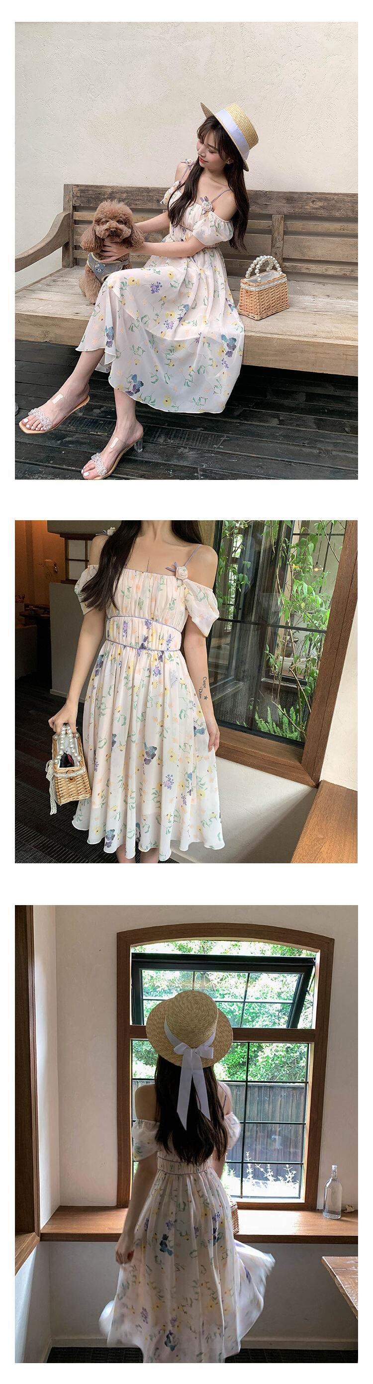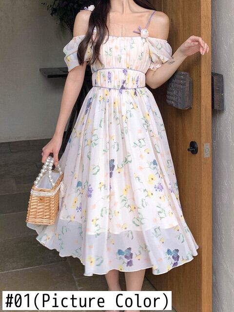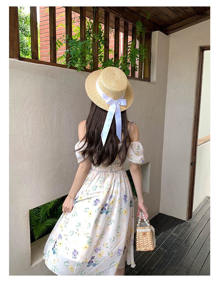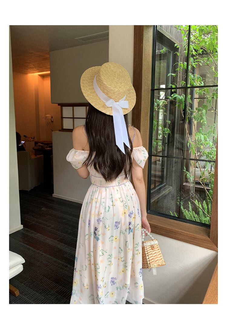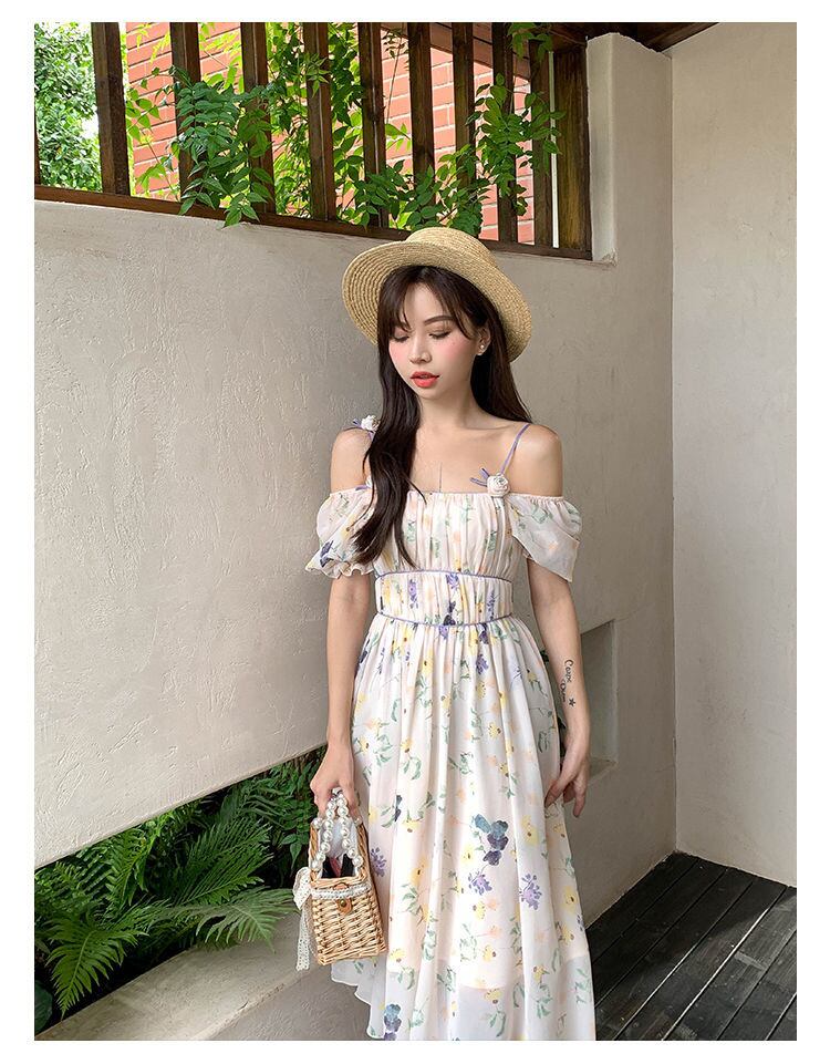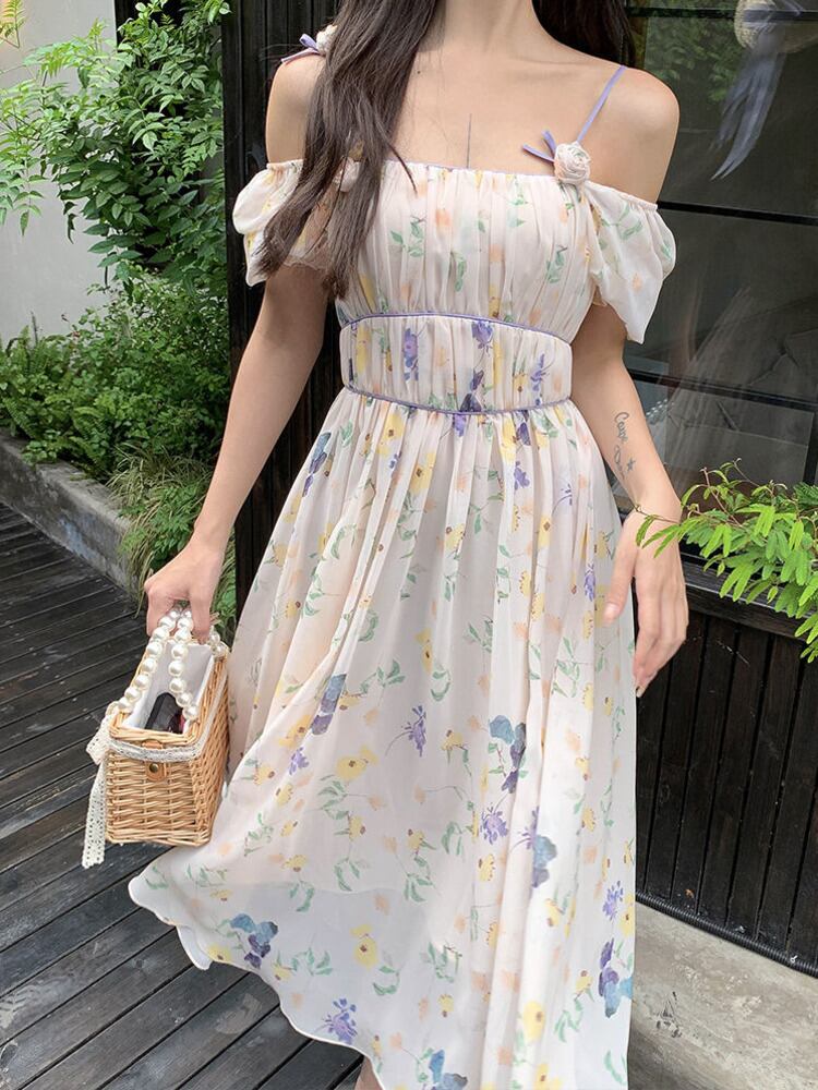 フランスの花プリントパーティーシフォンロングドレス女性スウィート自由奔放に生きるビーチホリデーサマードレスローブ Vestidos 大人ガーリー キュート カジュアル 夏物 花柄 mes45845251317