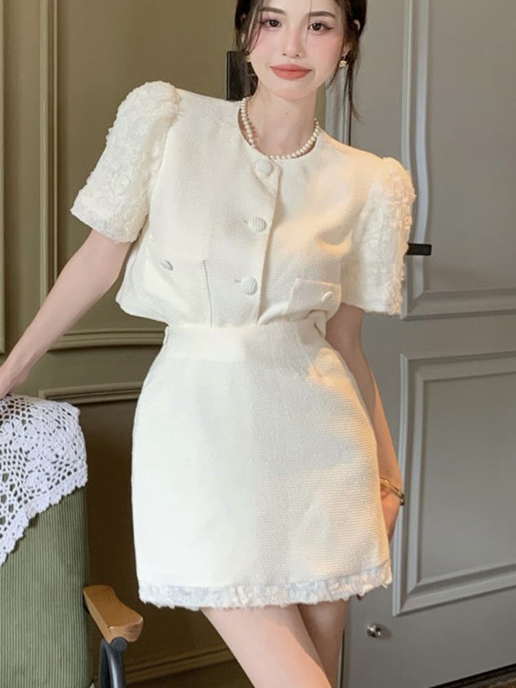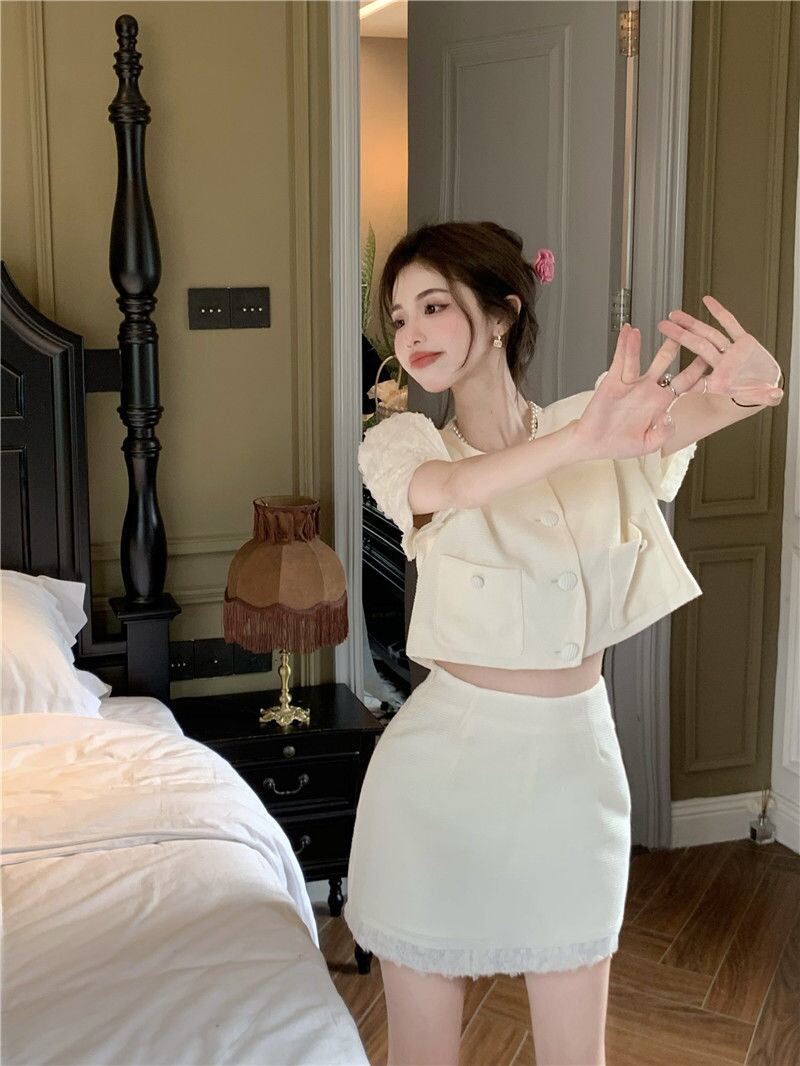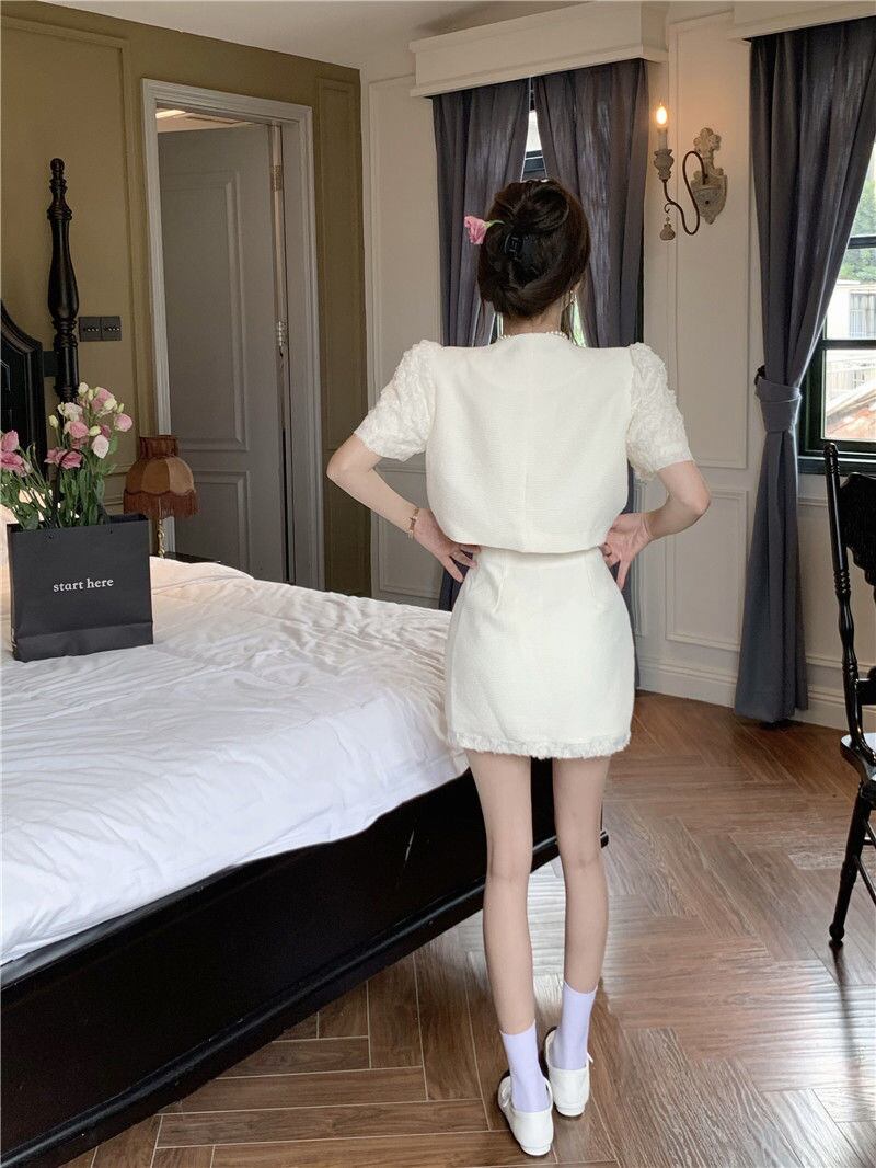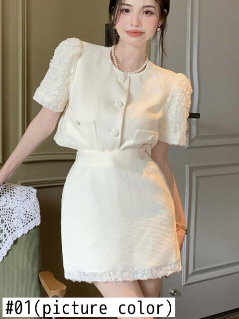 OL スモール フレグランス ツーピース セット レディース 半袖 クロップトップ + スカート セット サマーセット レディース アウトフィット ショート ハーフスリーブ 夏物 mes80387089534