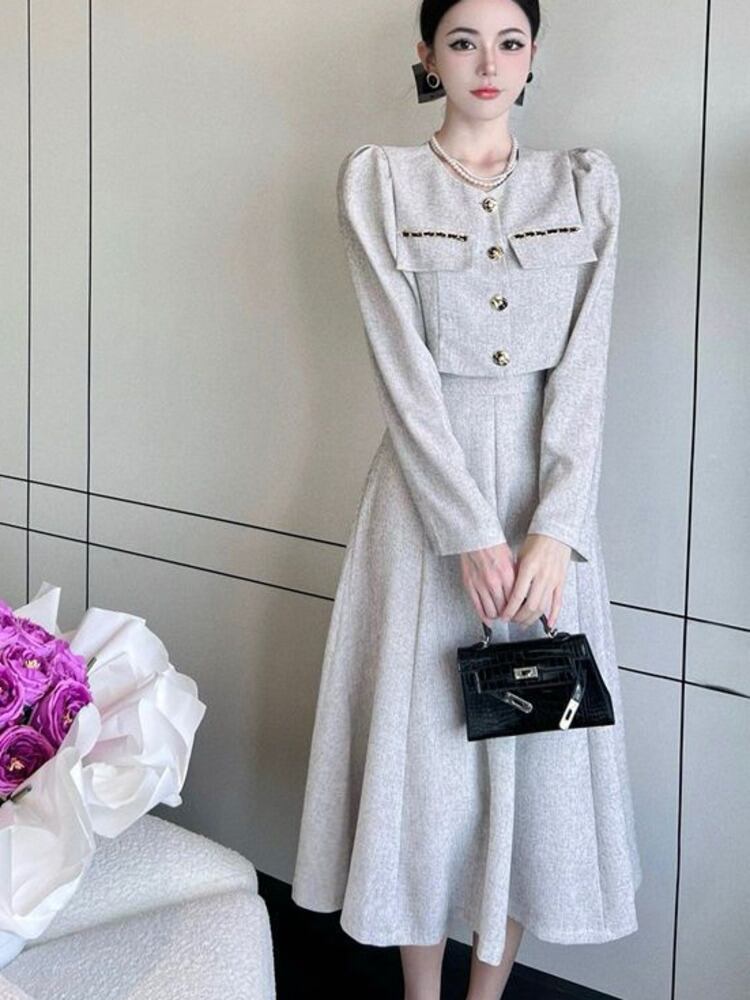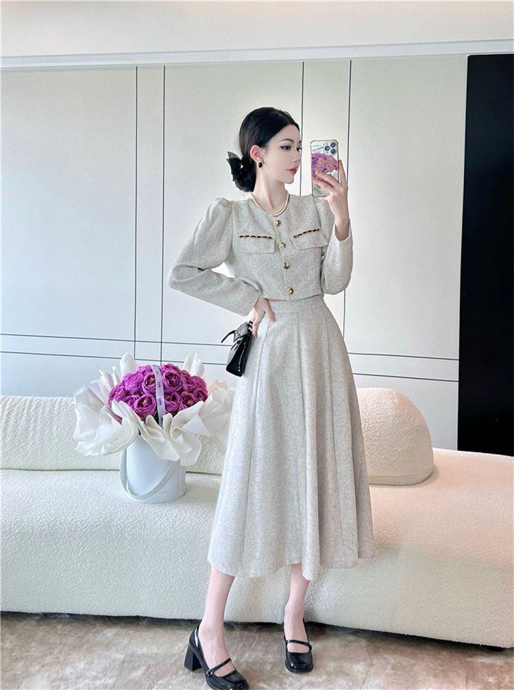 秋の小さな香り 2 点セット女性ショートコートクロップトップ + ウエストスカートセット OL ツーピーススーツ オータム 秋物 mes71265918995