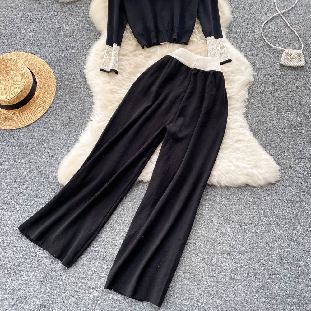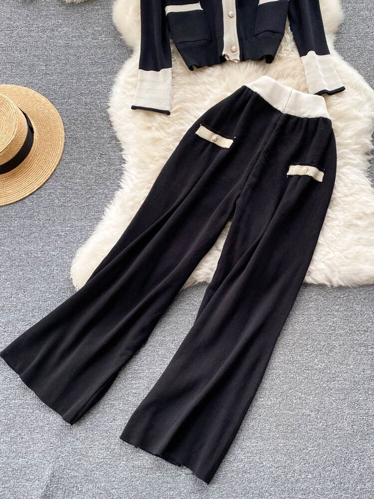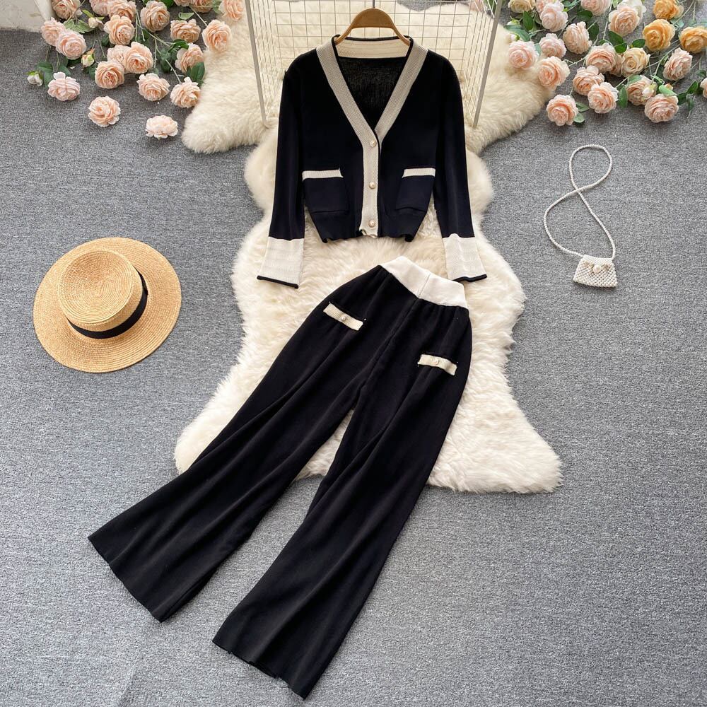 ニット 2点セット レディース カーディガン コート + ワイドパンツ スーツ 小さめフレグランス ツーピース パンツセット ワイドレッグ mes16654043771