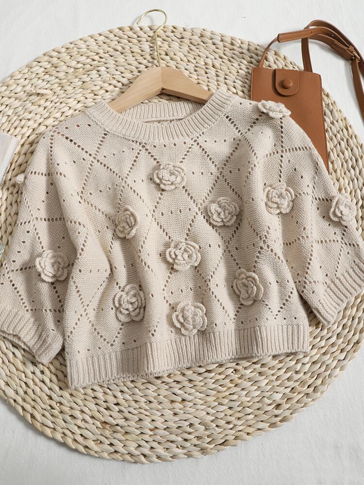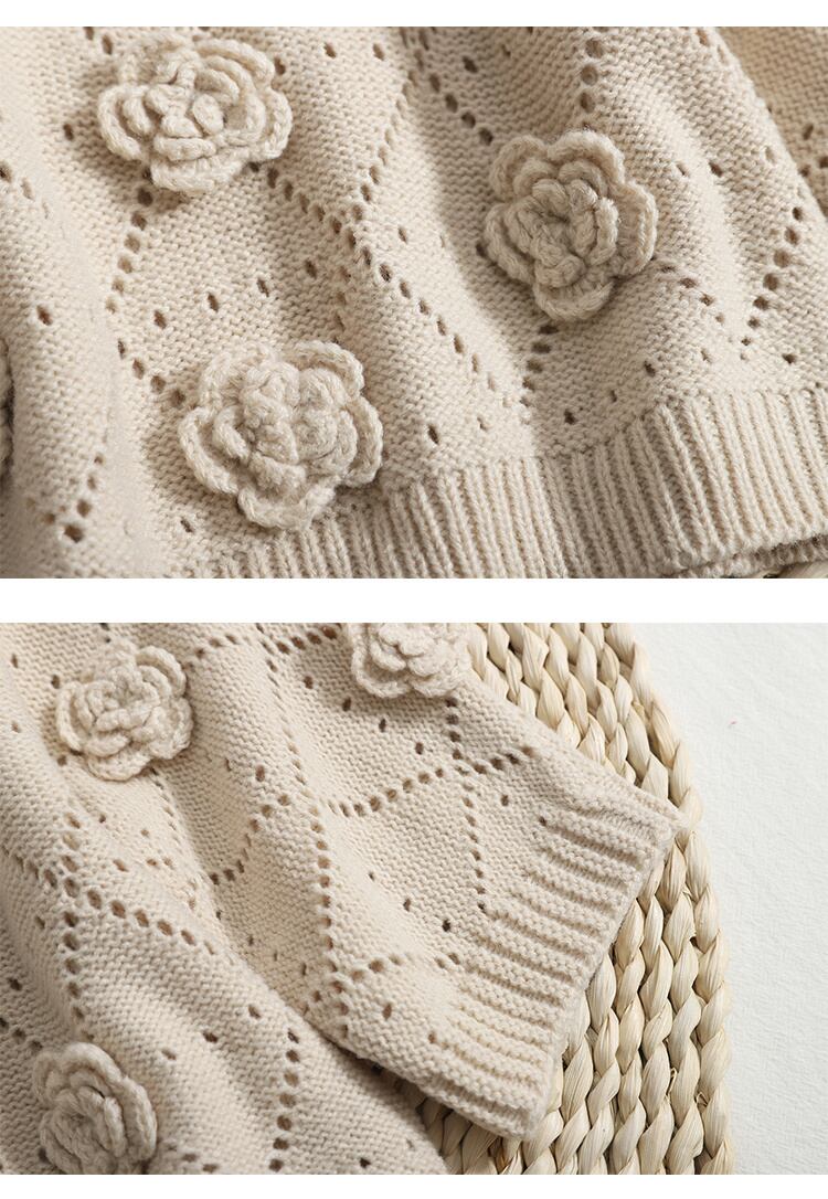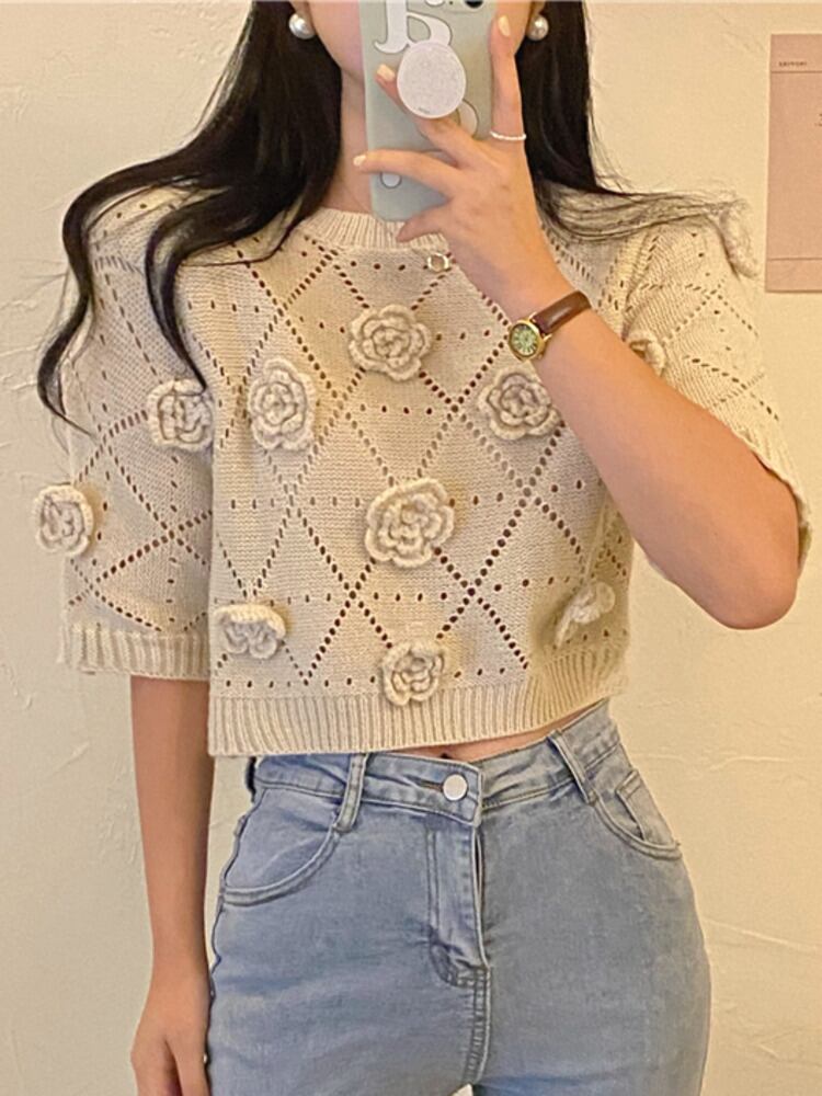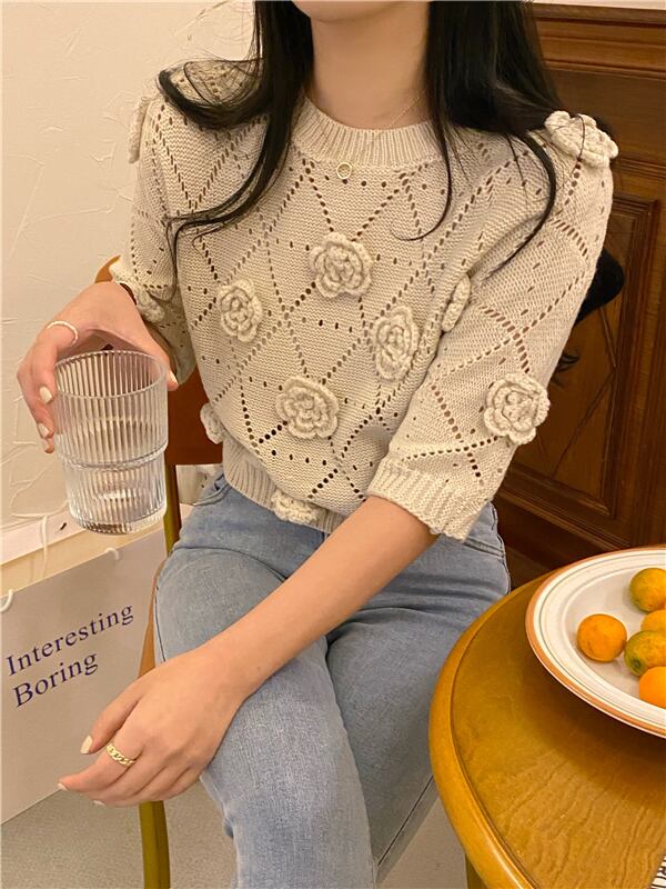 夏立体花ニットセータークロップトップ女性の半袖中空アウトニットプルオーバープル ショート ハーフスリーブ サマー 夏物 フラワーデザイン mes94420063854