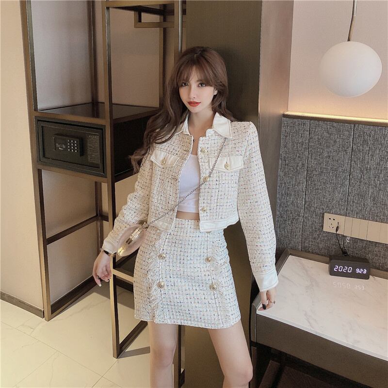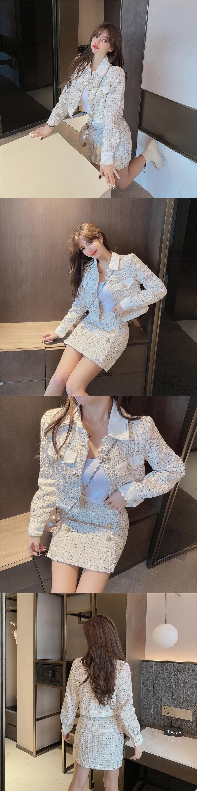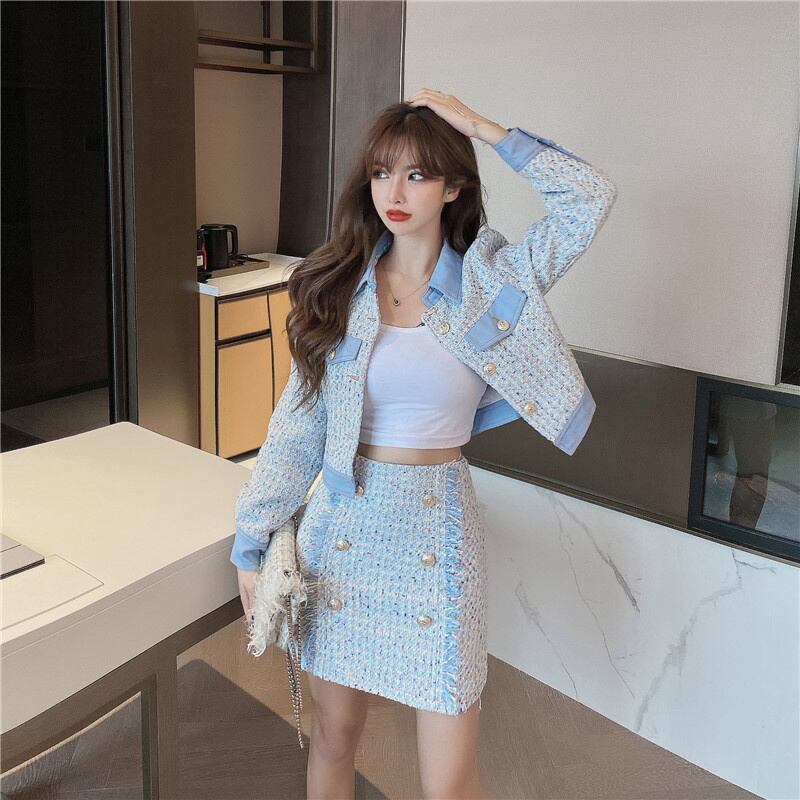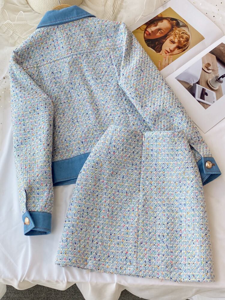 秋冬ツイードツーピースセット女性クロップトップデニムステッチショートジャケットコート + スカートセット 2 ピーススーツ ウィンター 冬物 mes67605336874
