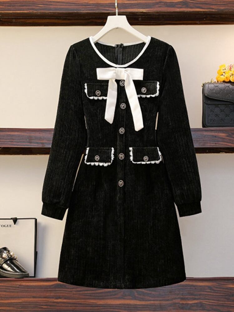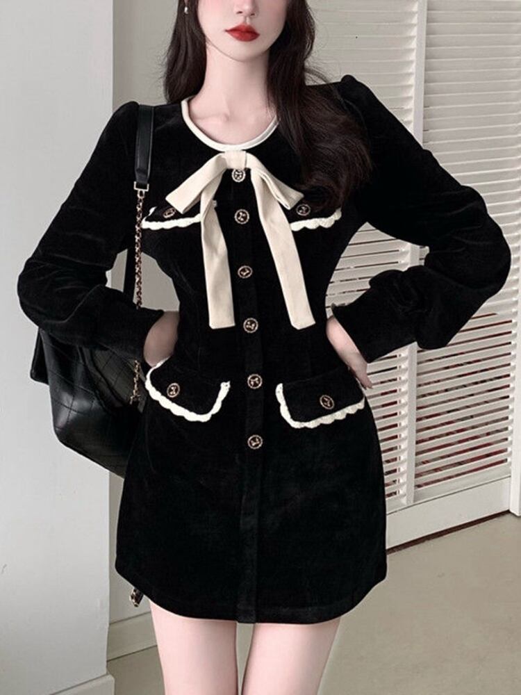 フレンチスモールフレグランスブラックミニドレス女性秋冬長袖弓レースアップスリムパーティードレス ロング リボン オータム 秋物 ウィンター 冬物 mes56246993919