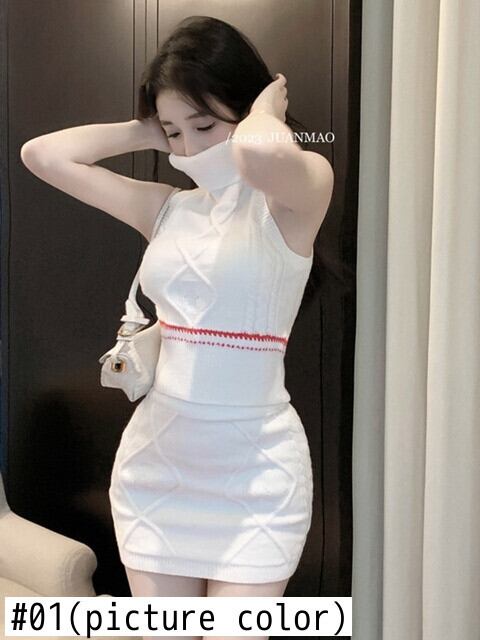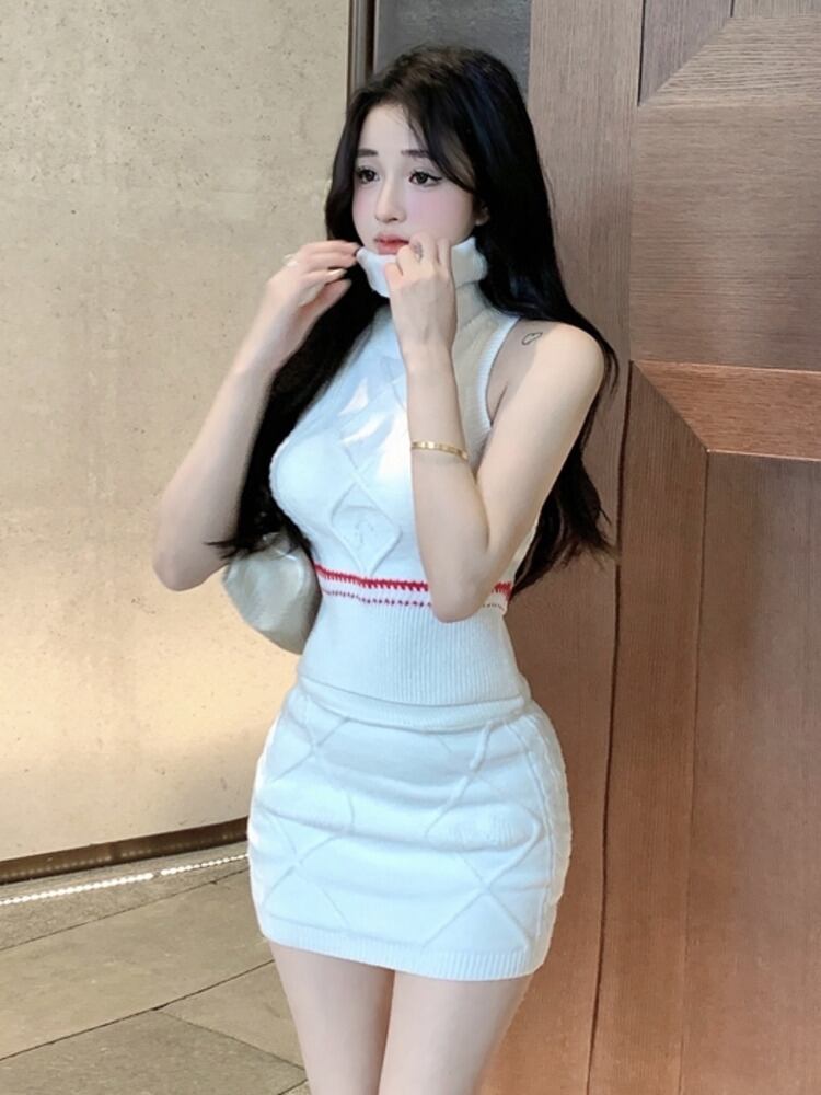 春 HotSweet ニット 2 点セット女性タートルネックノースリーブセクシーなセータープルオーバークロップトップ + ボディコンスカートセット 大人ガーリー スウィート キュート カジュアル スプリング 春物 mes92359658167