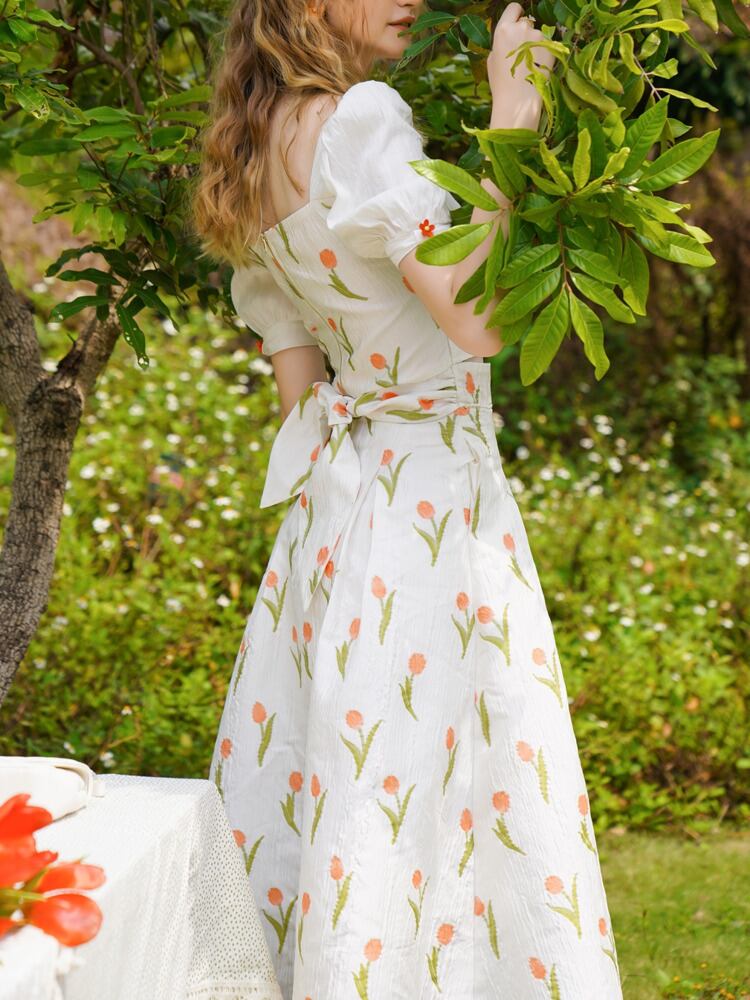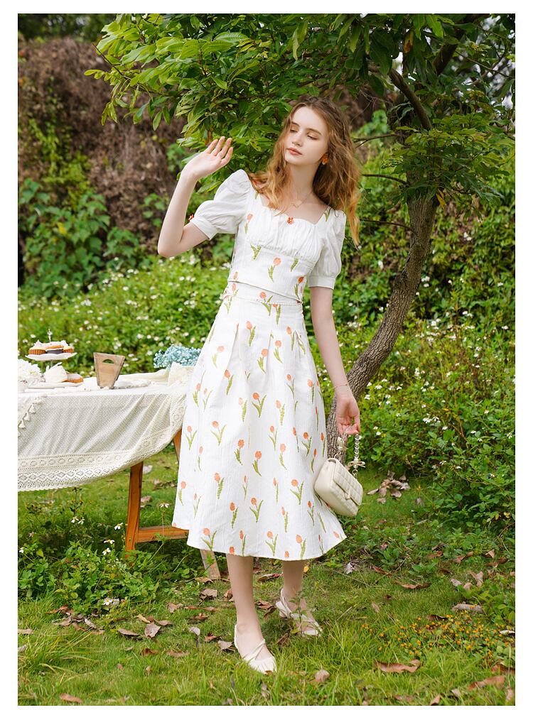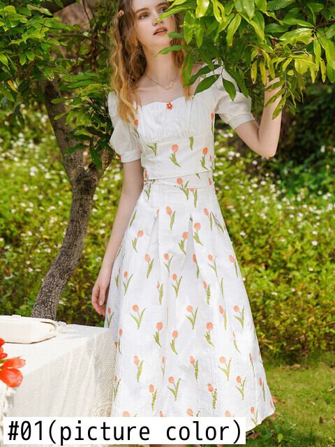 チューリップジャカードフランス 2 点セット女性クロップトップ + ビーズレースアップウエストスカートセット甘いスーツ夏 2 点セット 大人ガーリー スウィート キュート カジュアル サマー 夏物 mes65855502712