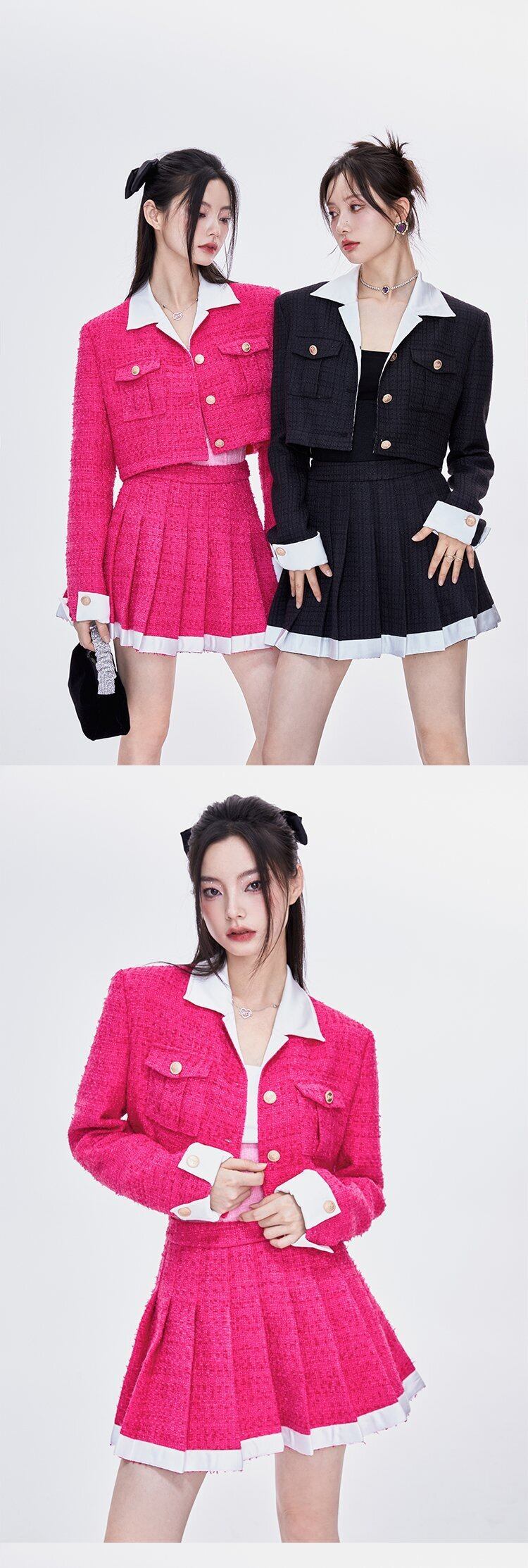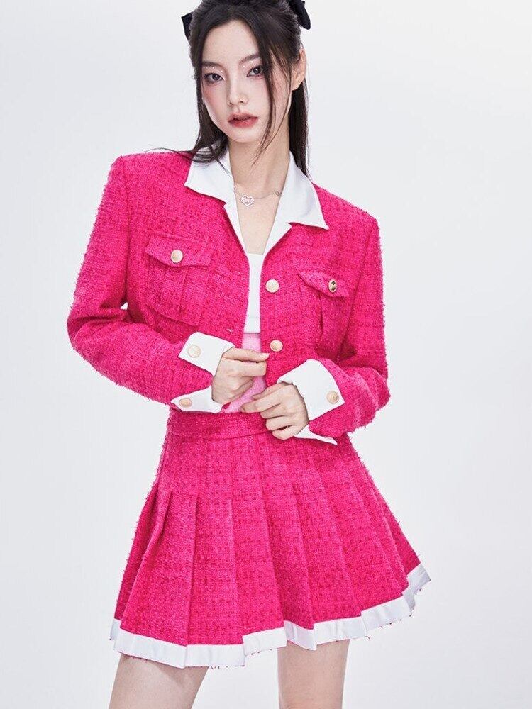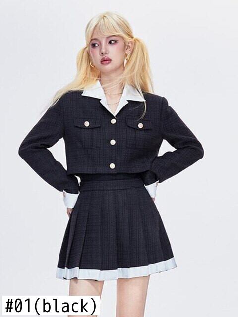 甘い小さな香りツイード 2 点セット女性クロップ トップ ショート ジャケット コート + プリーツ スカート スーツ秋 2 点セット 大人ガーリー スウィート キュート カジュアル mes29272768896