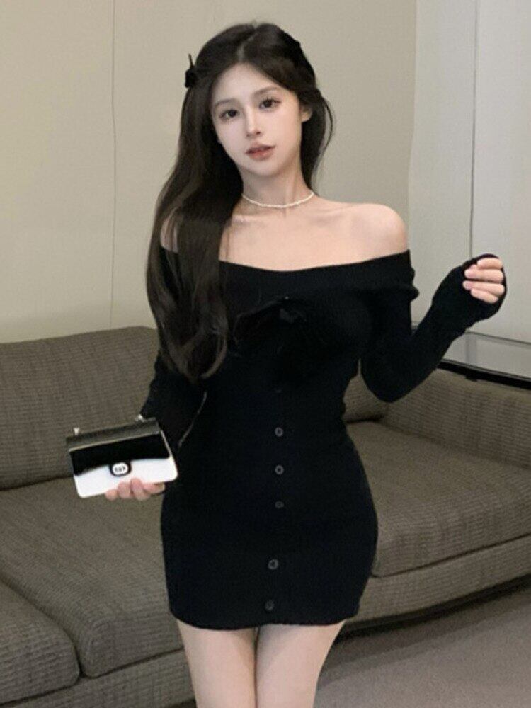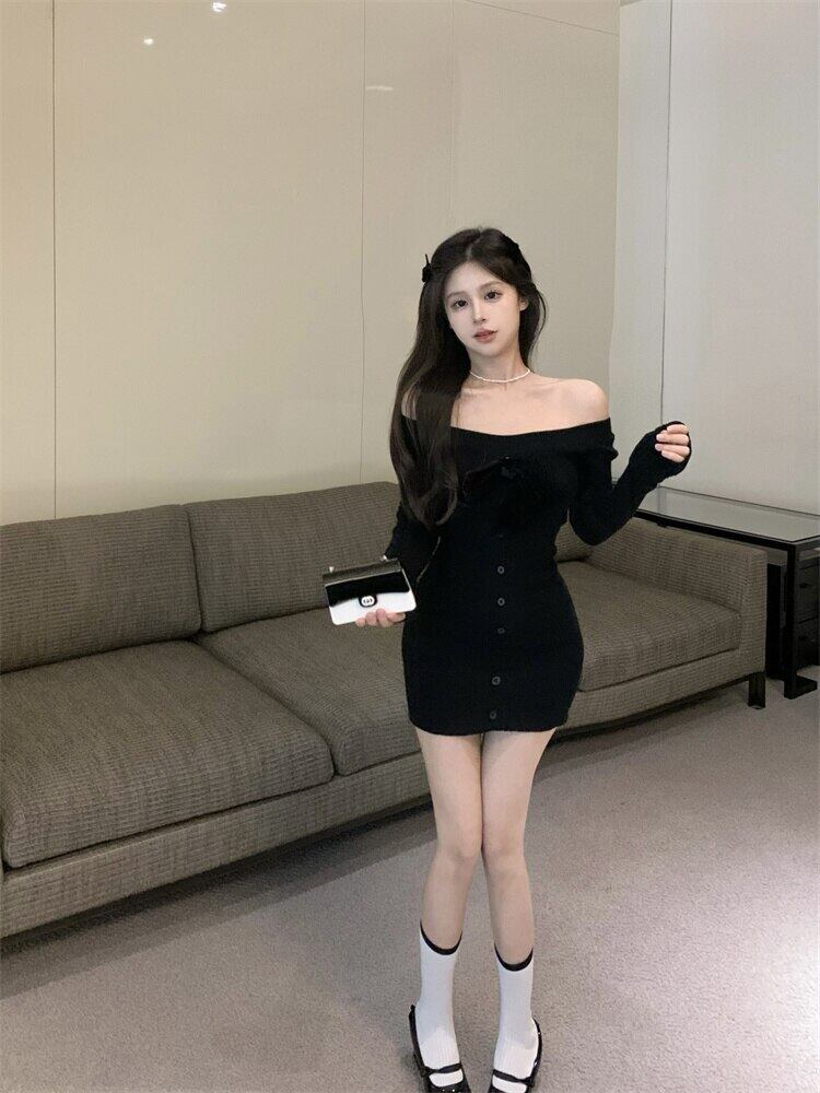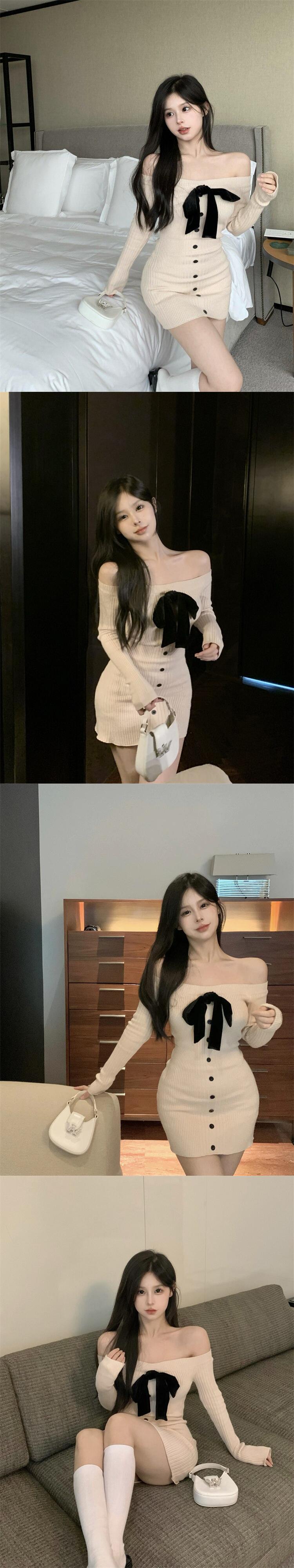 春ちょう結びセクシーなオフショルダーニットドレス女性スウィートシースボディコンミニセータードレスローブ リボン 大人ガーリー キュート カジュアル スプリング 春物 mes55739246757
