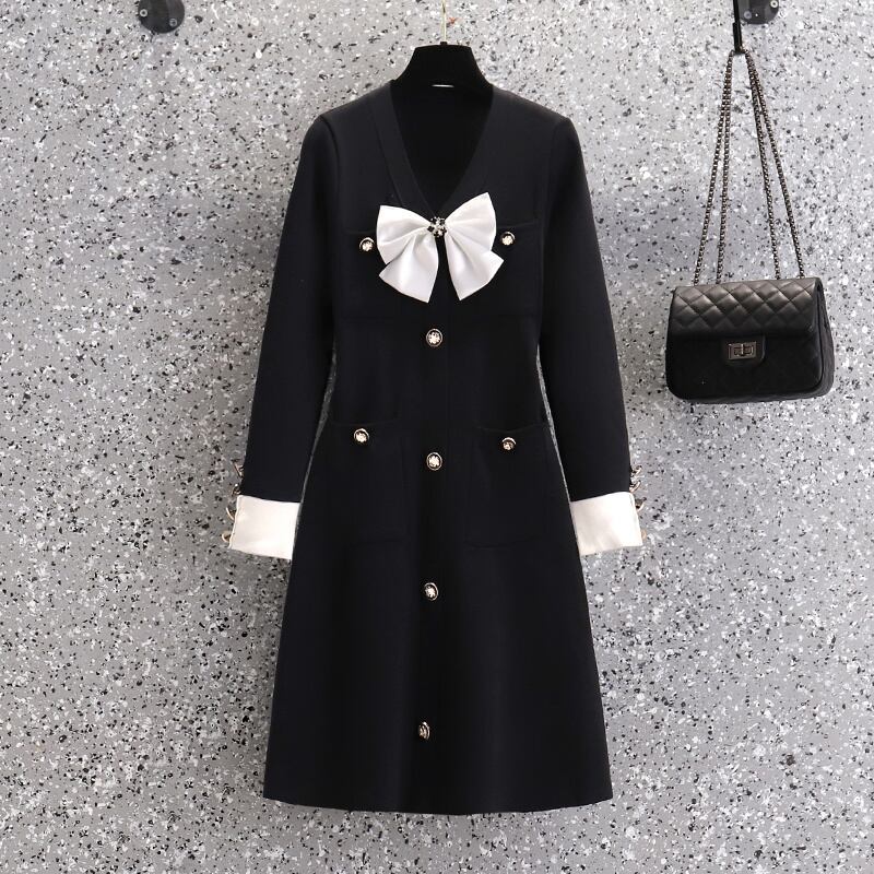 小さな香りニットセータードレス女性弓ボタンパーティーミニドレス秋冬黒ローブ Vestidos ブラック リボン ウィンター 冬物 mes69724549259