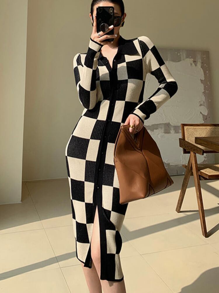 フレンチチェッカーボード膝丈ニットドレスレディース秋冬スタイルセータードレスボディコンローブ ウィンター 冬物 mes28721767375