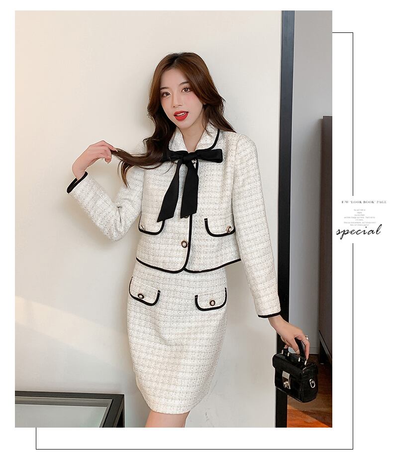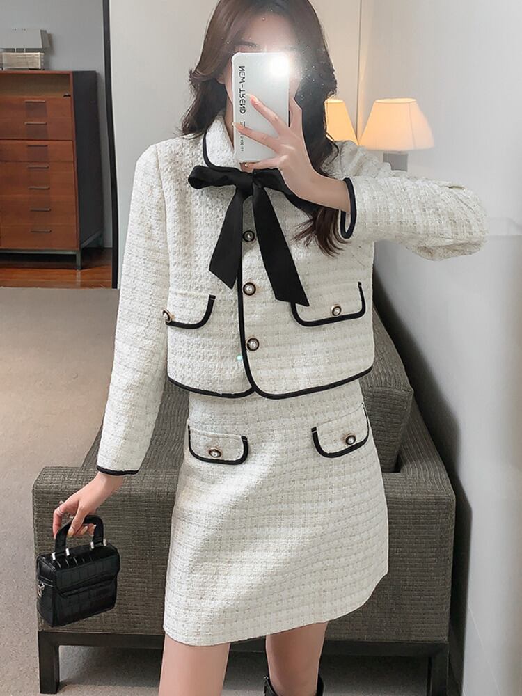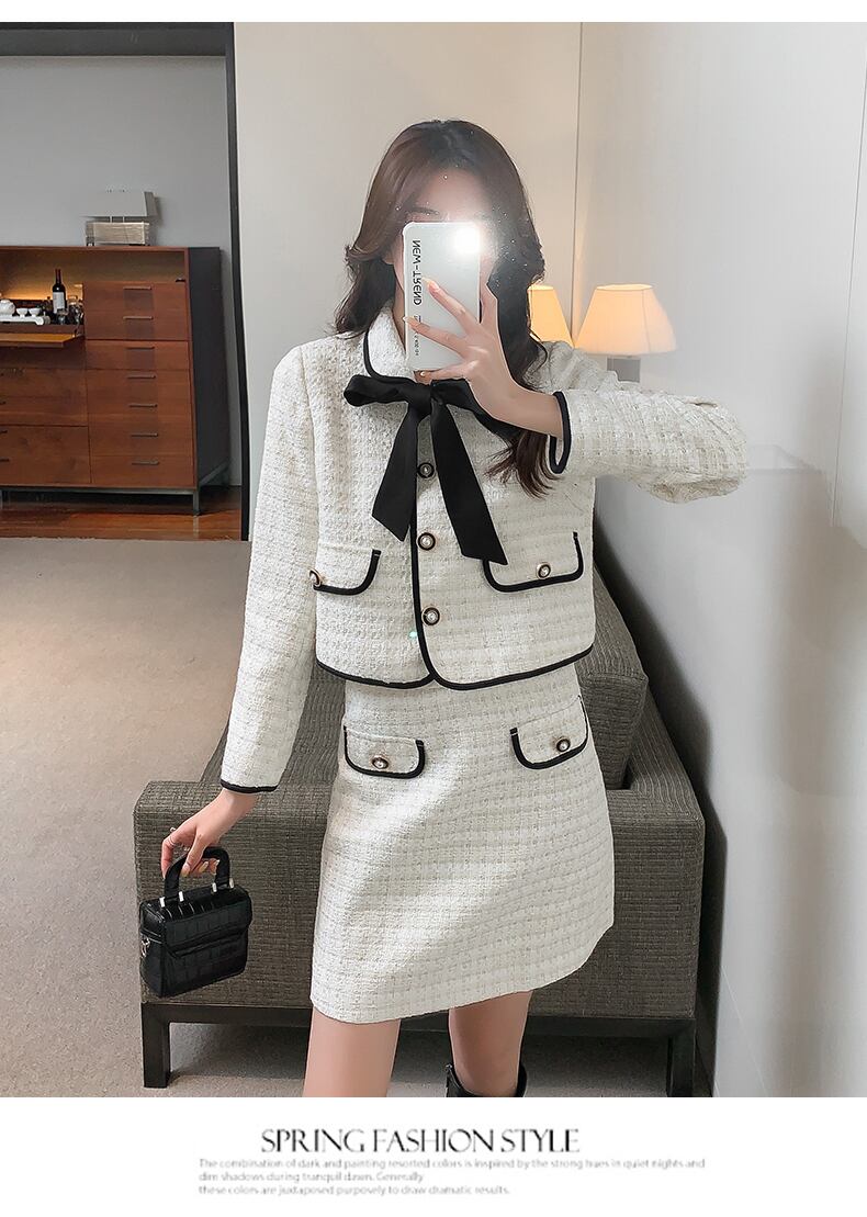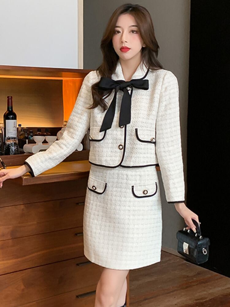 秋冬小さな香りツイード 2 点セット女性レースアップ弓ジャケット コート + スカート スーツ甘い 2 点セット リボン 大人ガーリー スウィート キュート カジュアル オータム 秋物 ウィンター 冬物 mes17468042875