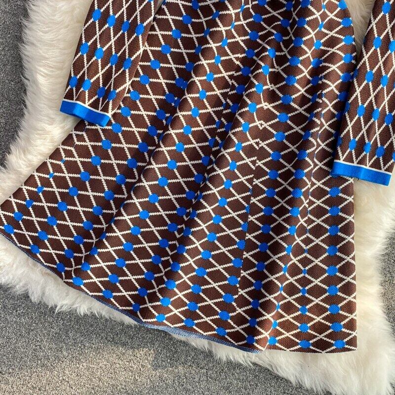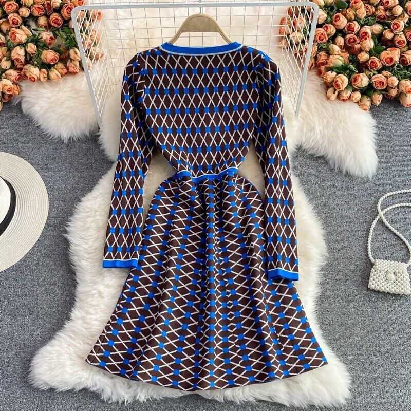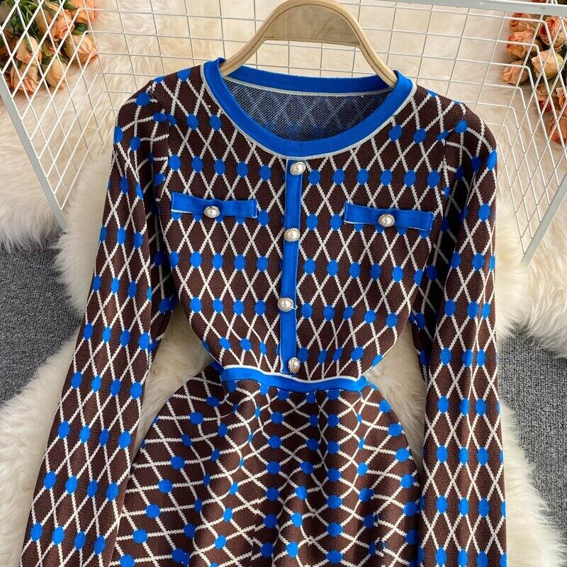 秋ニットセータードレス女性長袖 A ラインパールボタンチェック柄ミニドレスローブ ロング オータム 秋物 Aライン 真珠 mes76291691076