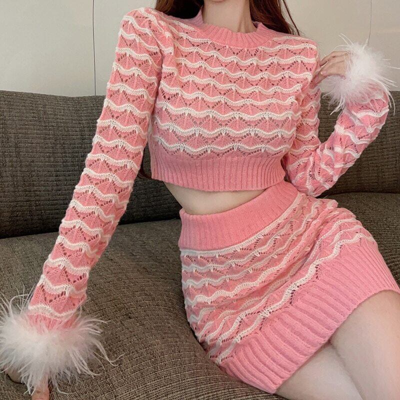 春ニットツーピースセット女性の羽長袖セータープルオーバークロップトップ + ボディコンスカートセット甘い 2 ピーススーツ ロング 大人ガーリー スウィート キュート カジュアル スプリング 春物 mes59234438624