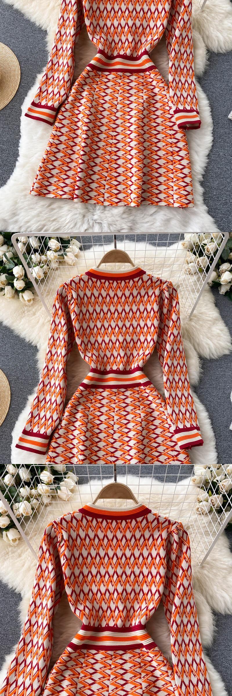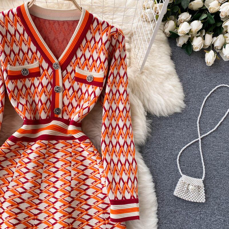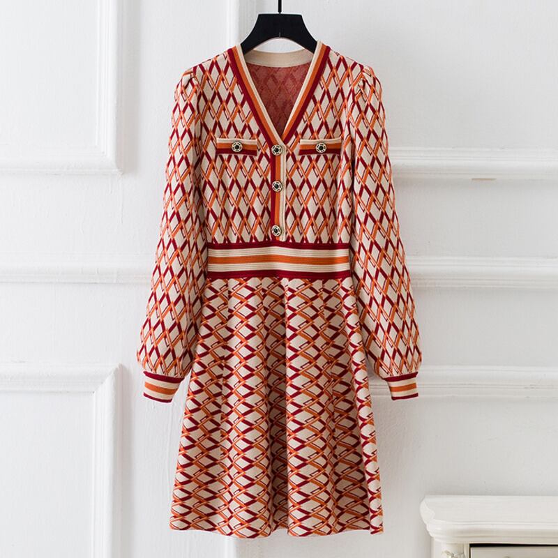 秋冬ミニパーティークリスマスドレス女性 V ネック長袖幾何学模様ニットセータードレスローブ ロング オータム 秋物 ウィンター 冬物 Vネック mes18224392122