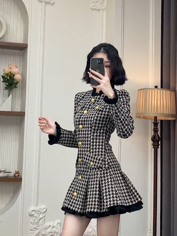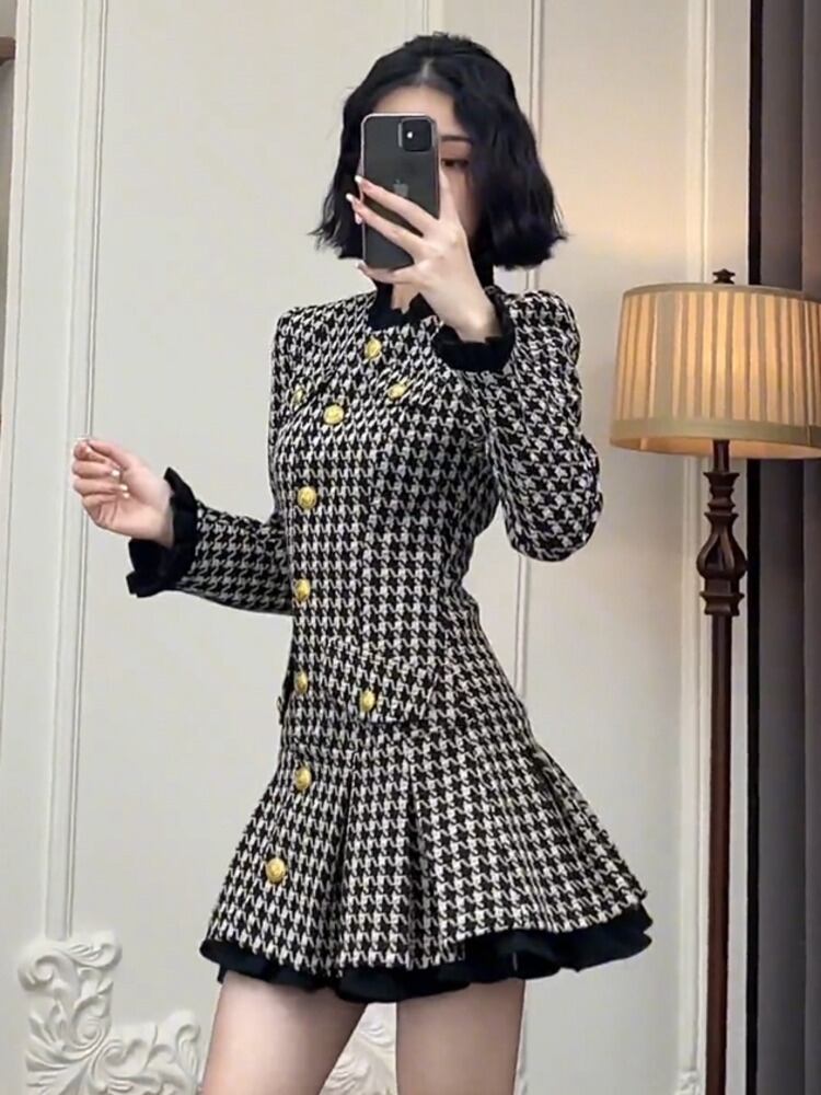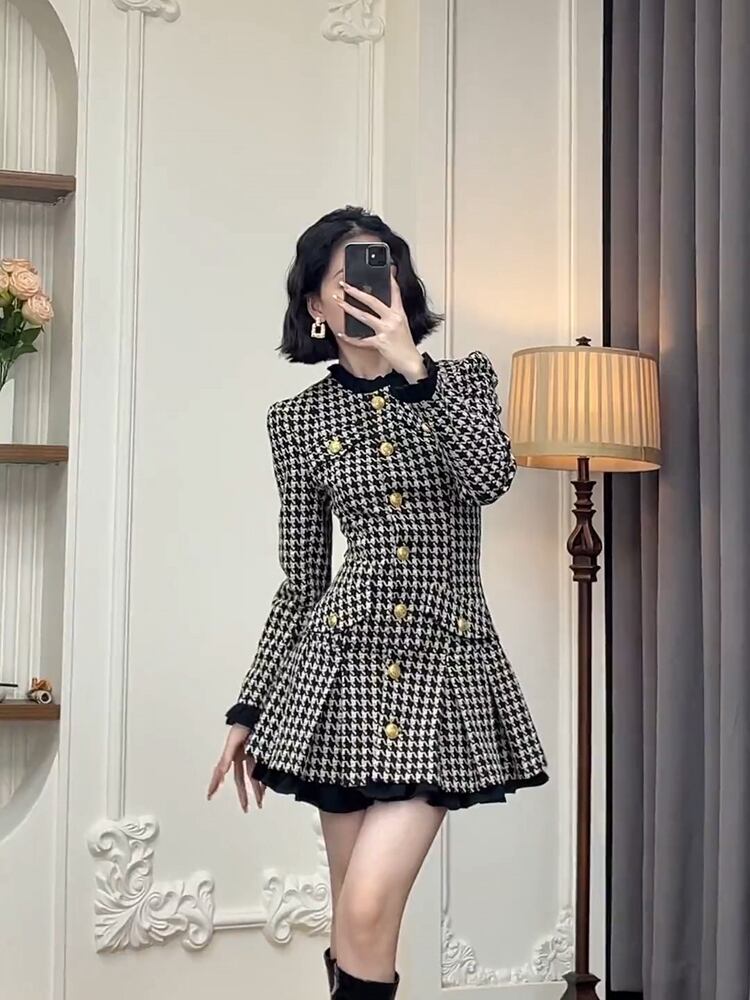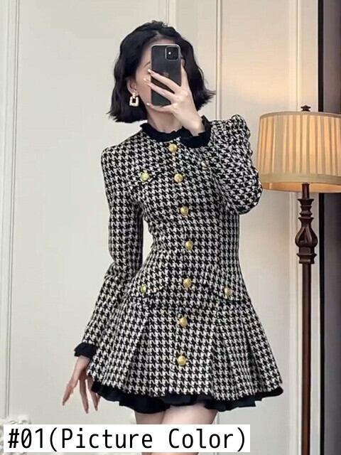 秋冬フレンチスモールフレグランスツイードドレス女性千鳥格子シングルブレストスリムウエストミニプリーツドレス ウィンター 冬物 mes96826557127