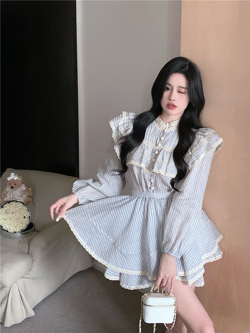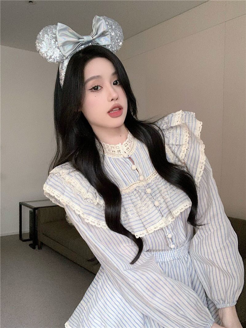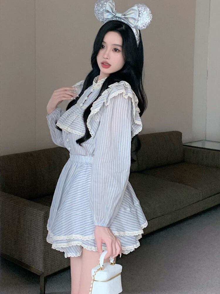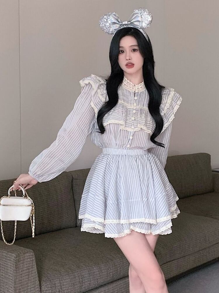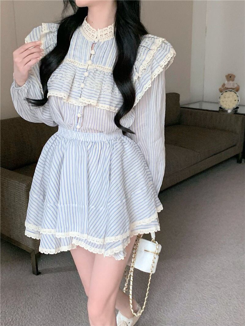 秋のフレンチストライプツーピースセット女性刺繍シャツトップ + ミニスカートセットスウィート 2 ピーススーツ 大人ガーリー キュート カジュアル オータム 秋物 mes50678478169