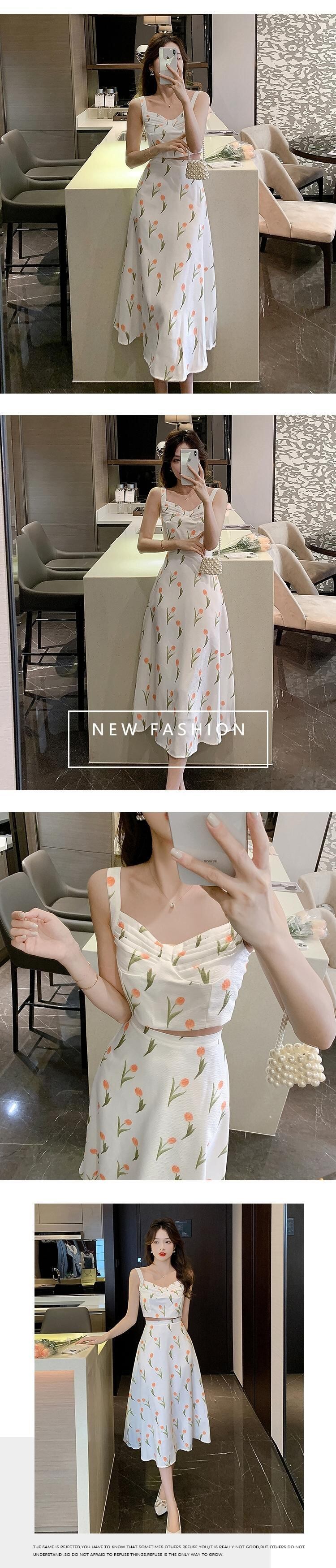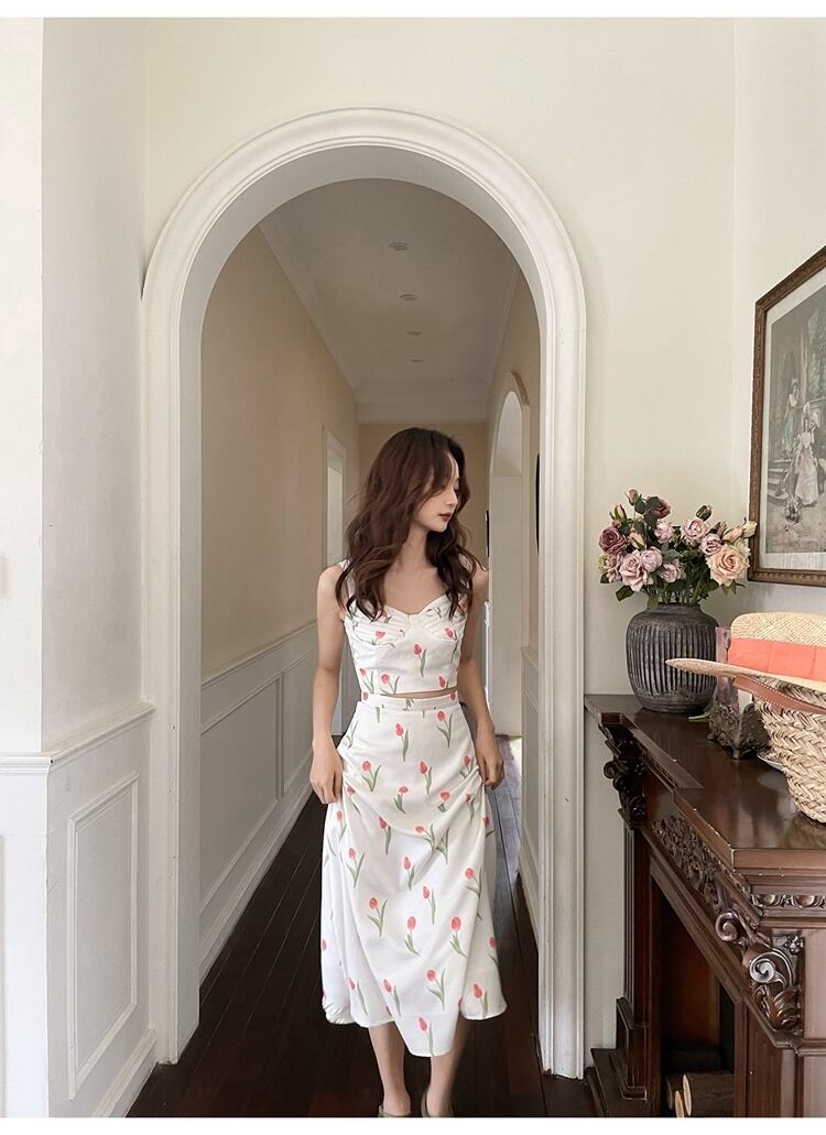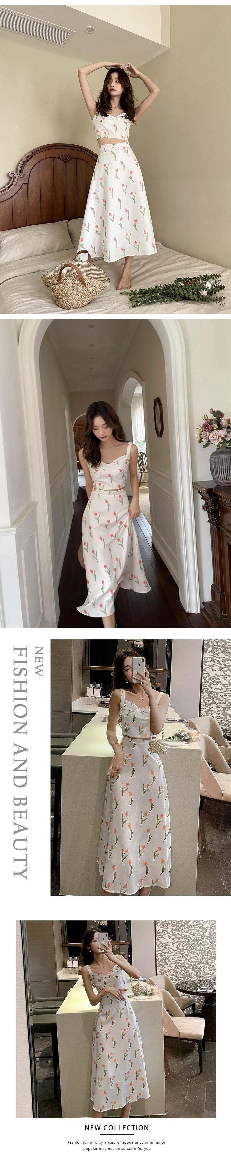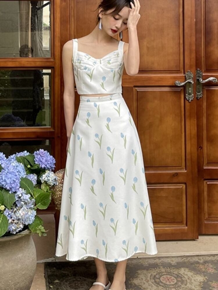 フランスツーピースセット女性のセクシーなクロップトップ + ロングスカートスーツ夏チューリッププリントホリデービーチ 2 ピーススーツ サマー 夏物 mes93884980179