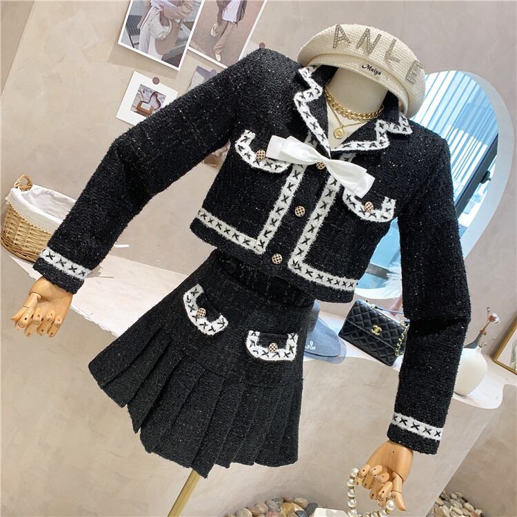 小さな香りツイード 2 点セット女性クロップ トップ弓ショート ジャケット コート + プリーツ スカート スーツ 2 点セット リボン mes95929509141