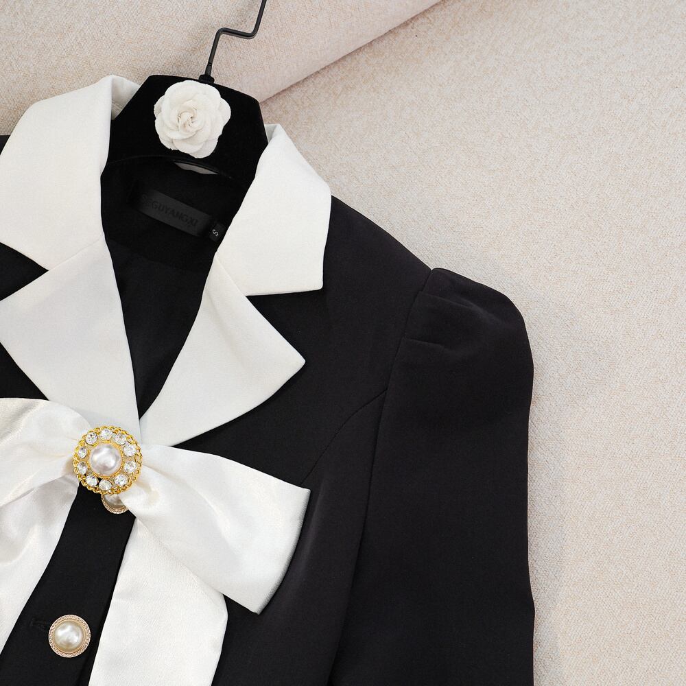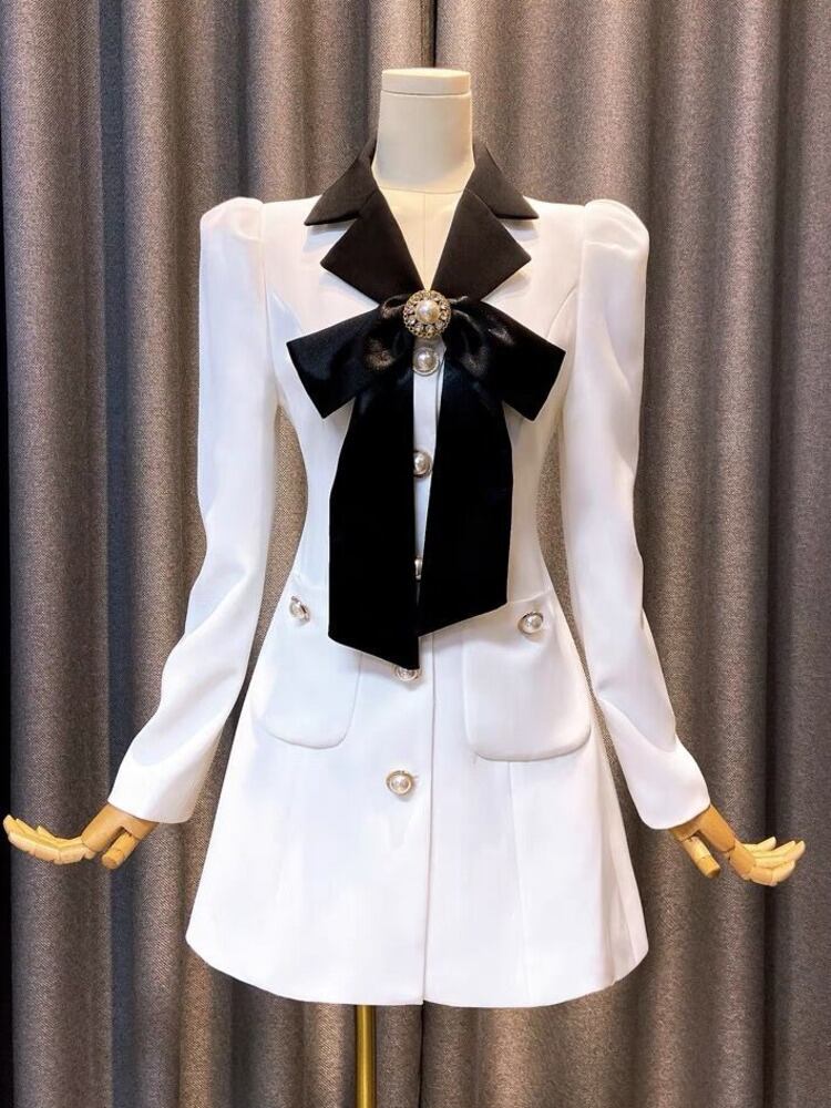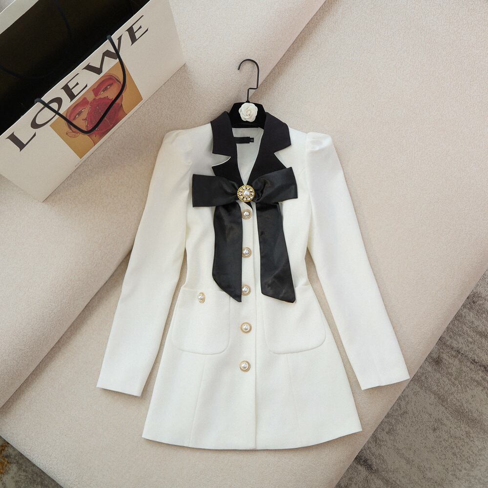秋の小さな香り長袖弓黒ミニドレス女性 OL シングルブレストスーツドレスローブ Vestidos ロング ブラック リボン オータム 秋物 mes62241041078
