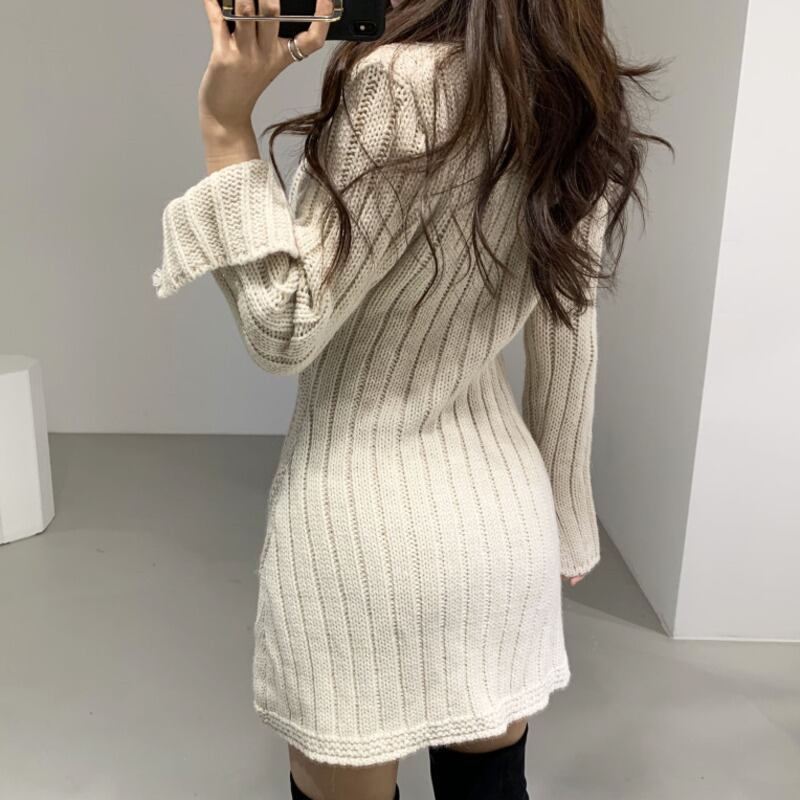 ツイストニットセーターミニドレス女性 V ネックシングルブレストパーティードレス秋冬長袖ドレスローブ ロング オータム 秋物 ウィンター 冬物 Vネック mes77398270757