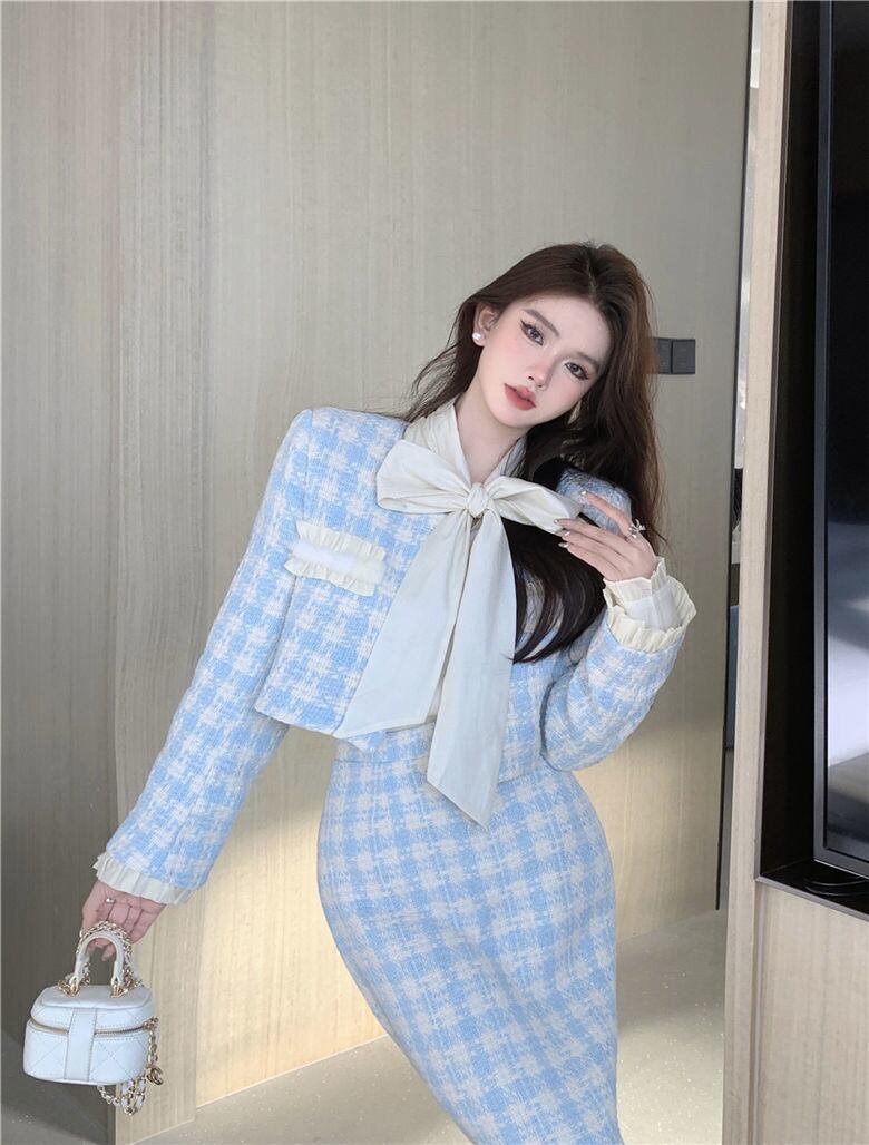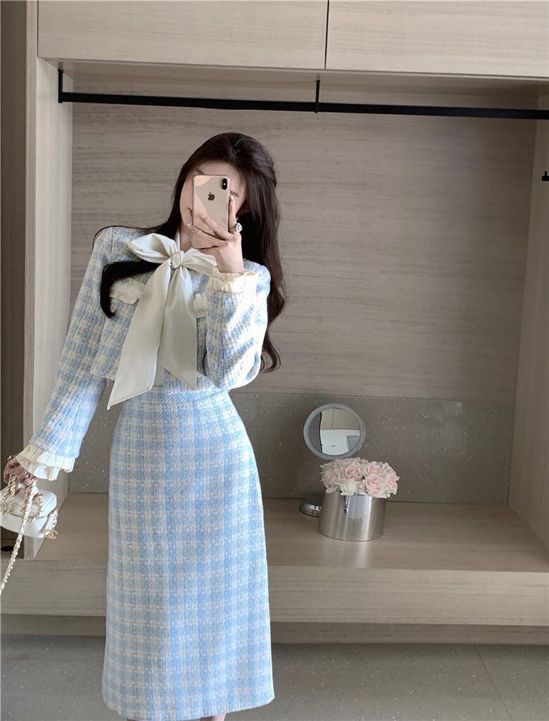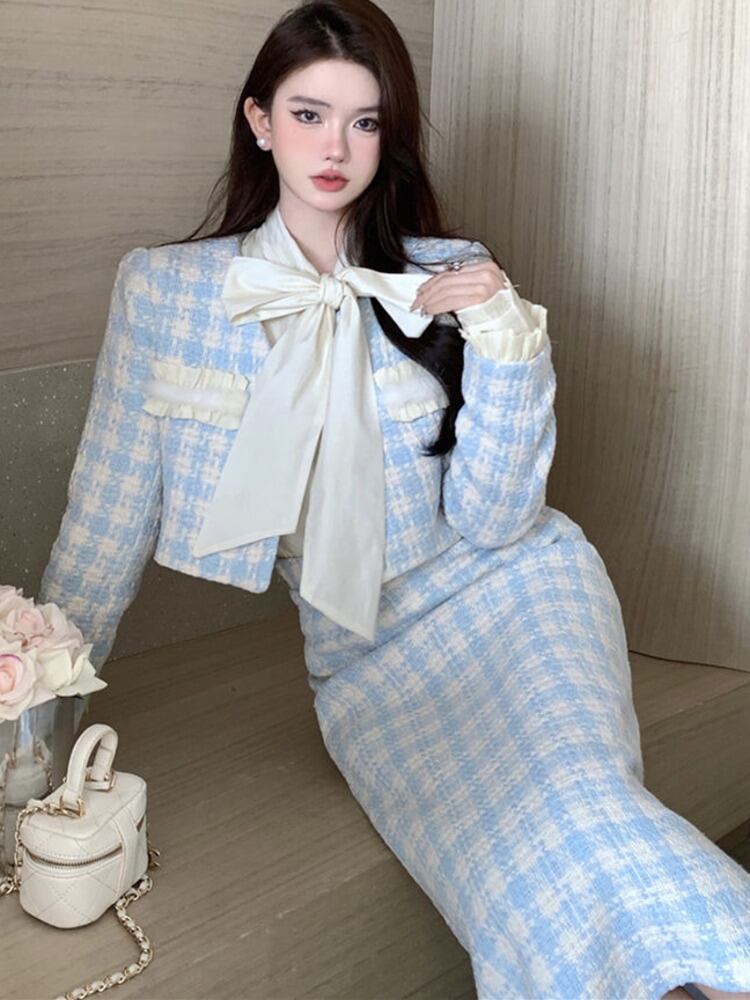 秋冬スモールフレグランスツイードツーピースセット女性クロップトップウールショートジャケットコート + ロングスカートセット 2 ピーススーツ ウィンター 冬物 mes26348096126