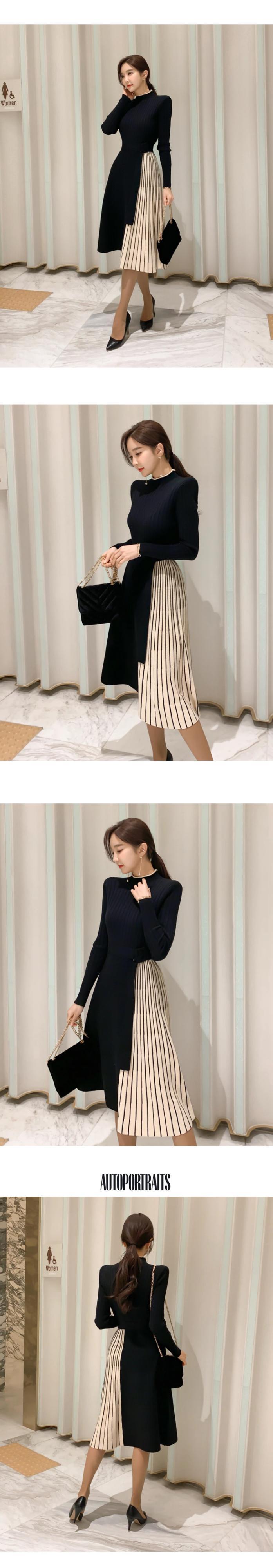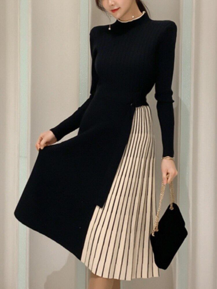秋冬女性ステッチストライププリーツセータードレス長袖 OL ミディニット滑走路 Vestidos ローブ ロング オータム 秋物 ウィンター 冬物 mes85536028386