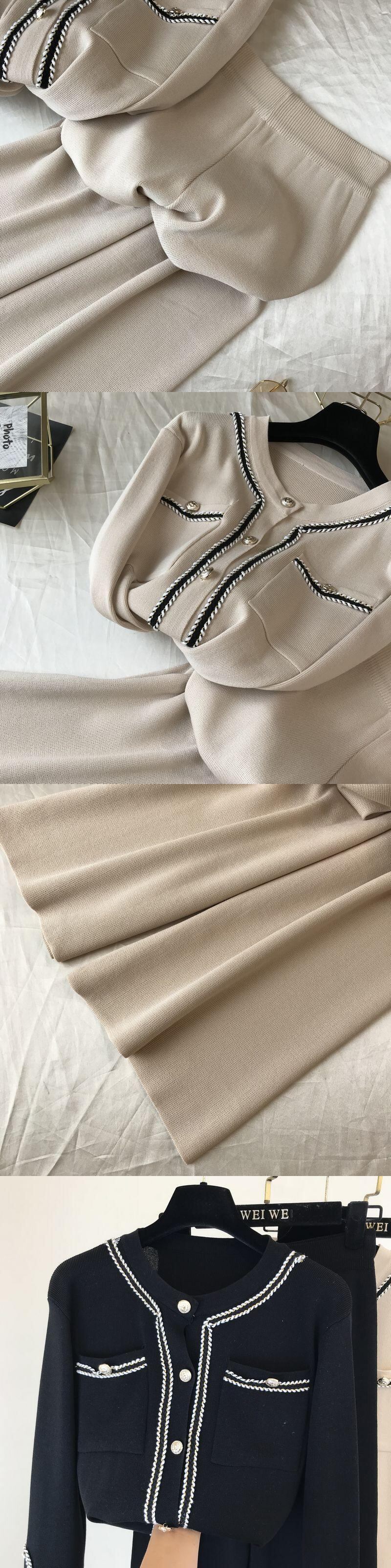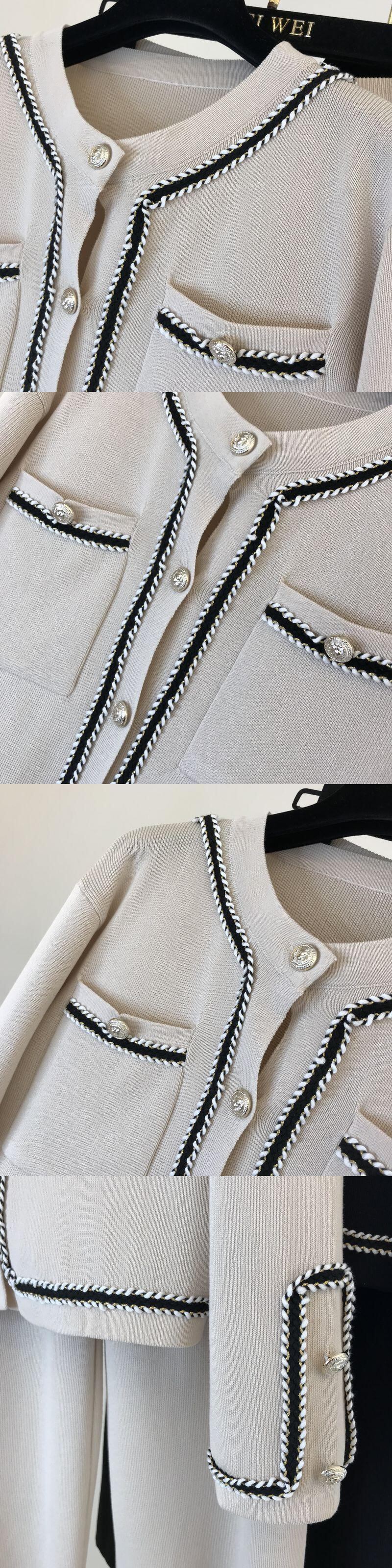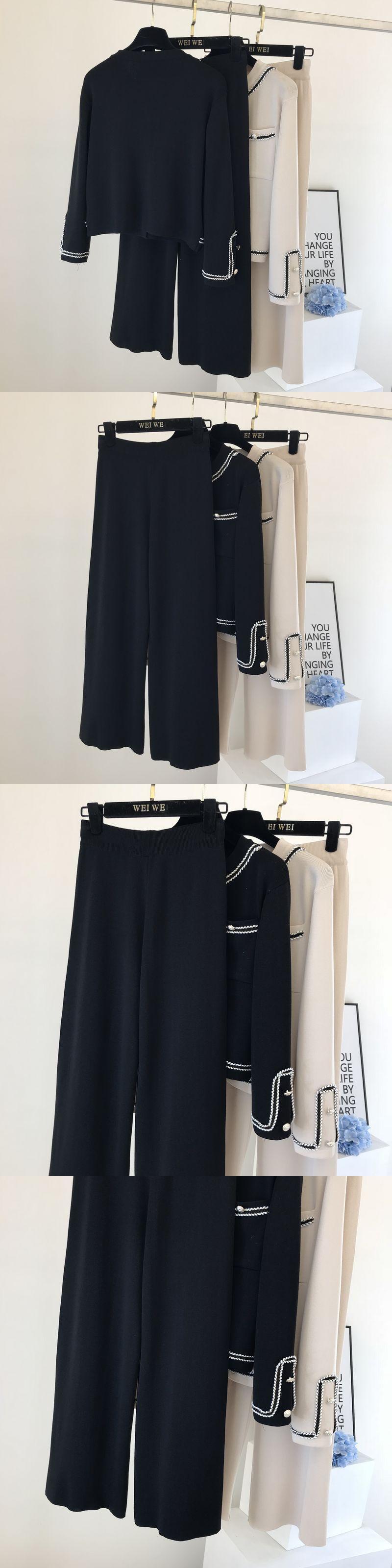 秋のカラーブロックラウンドネックダブルポケットニットカーディガントップス+ゆったりワイドレッグパンツツーピースパンツセットレディース オータム 秋物 Oネック ワイドパンツ mes26974312691