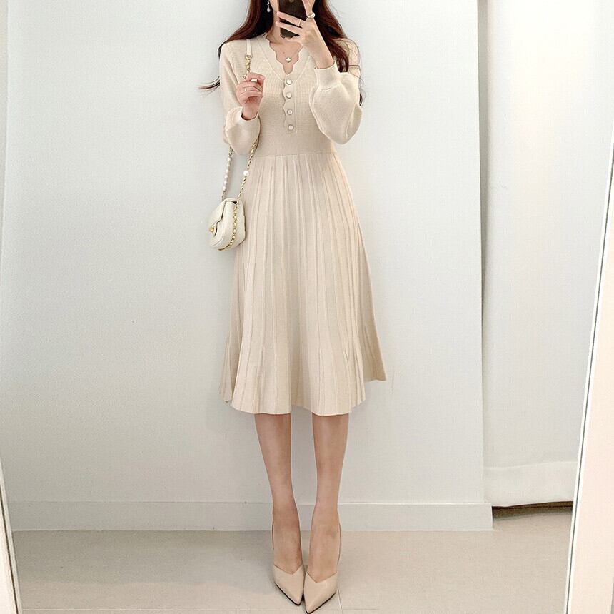 ワンピース プリーツ ドレス秋長袖スリム女性セーター ドレス ニット ミディ パーティー ドレス ロング オータム 秋物 mes64442034560