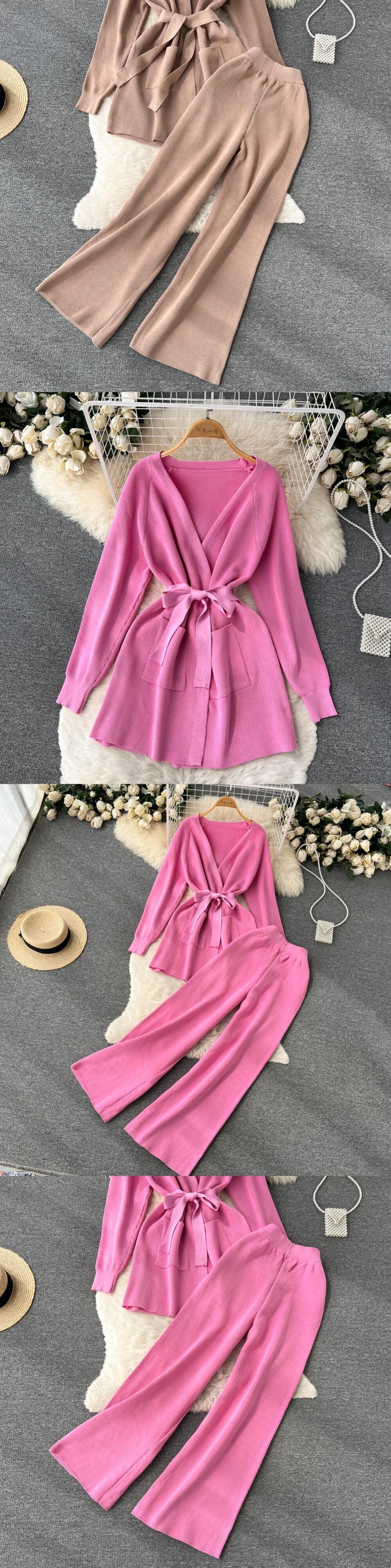 冬の女性ニットトラックスーツ 2 個長袖レースアップセーターカーディガンコート & パンツスーツツーピース衣装 ロング ウィンター 冬物 mes38815074218