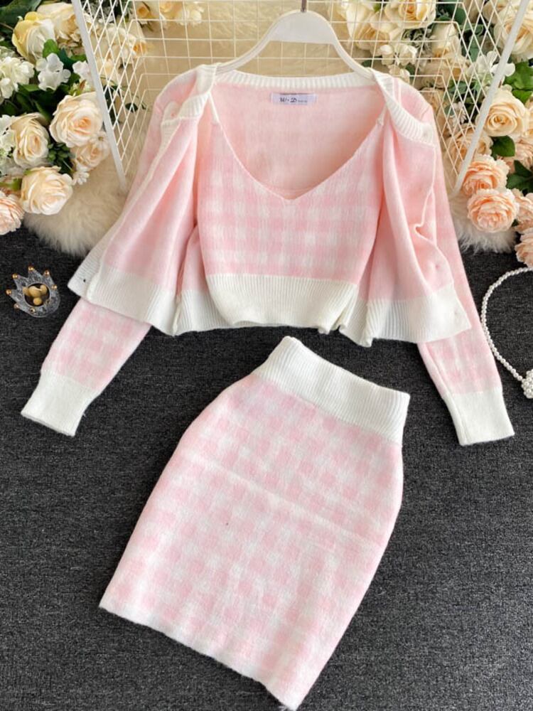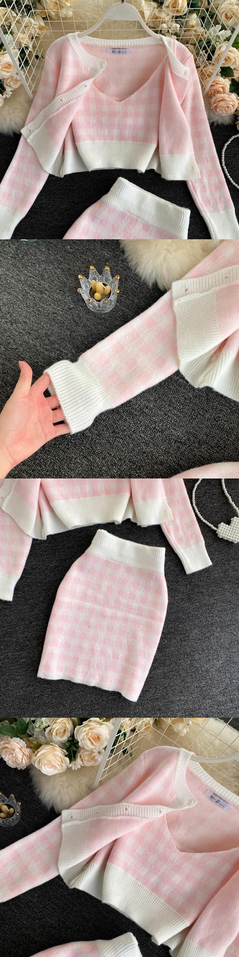 甘いニットチェック柄カーディガン + キャミソール + スカート 3 個セット女の子ショートセーターコート + ベスト + ミニスカートスーツ女性衣装 大人ガーリー スウィート キュート カジュアル mes4904993934