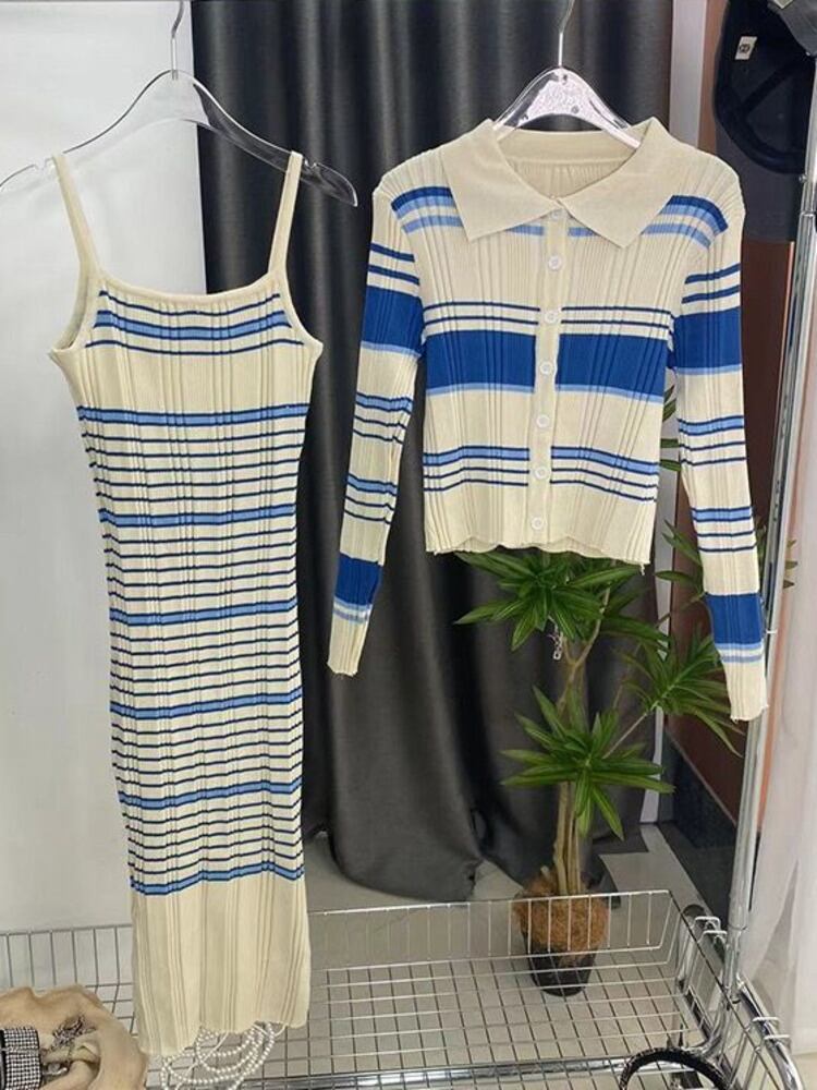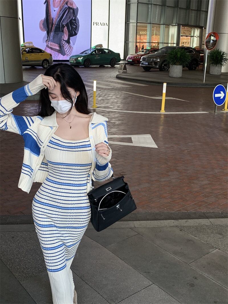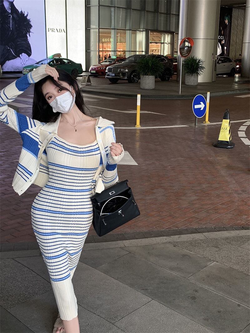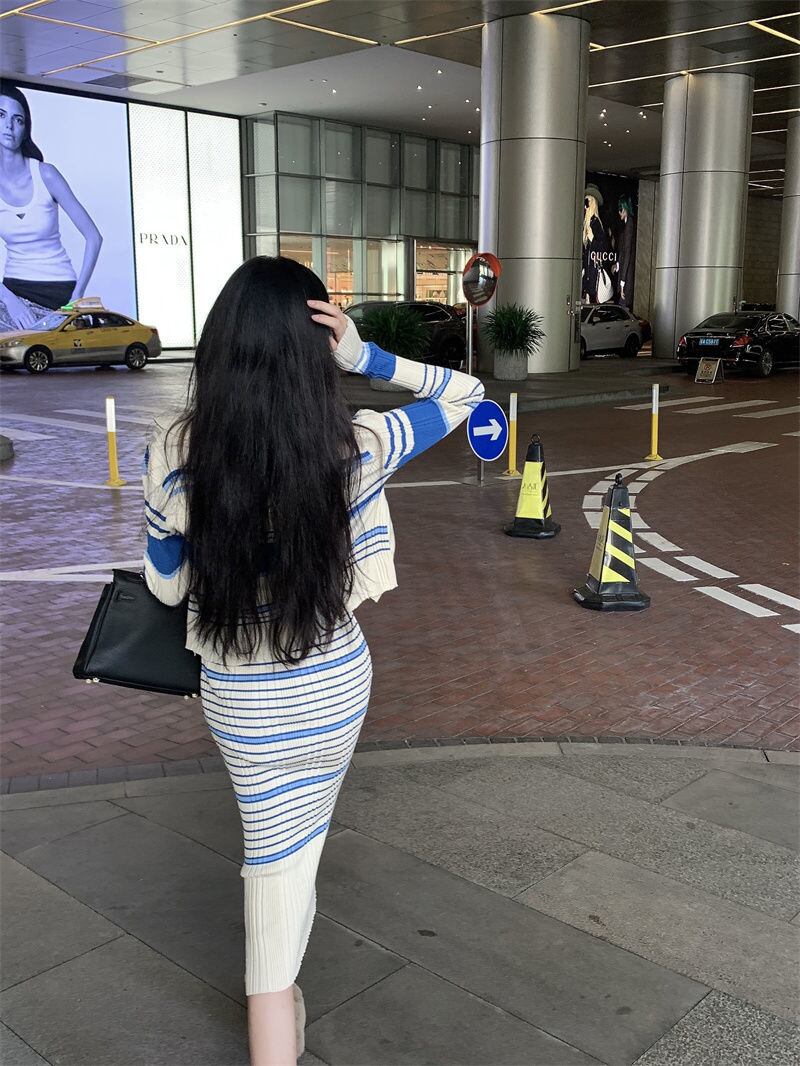 秋韓国ファッションツーピースセットレディース衣装カーディガンセータークロップトップドレスアンサンブルファムプルファム オータム 秋物 フェミニン mes19741852017