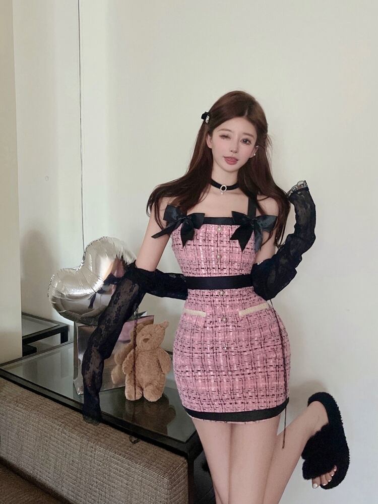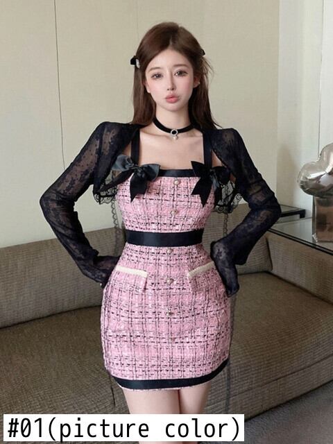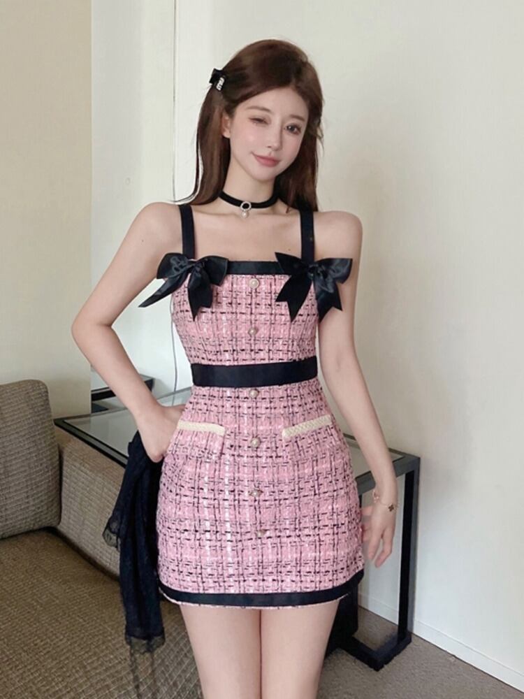 スモールフレグランスチェック柄ツーピースセット女性衣装クロップトップ & 織ちょう結びスリングドレスセット甘い 2 ピーススーツ リボン 大人ガーリー スウィート キュート カジュアル mes18574780091