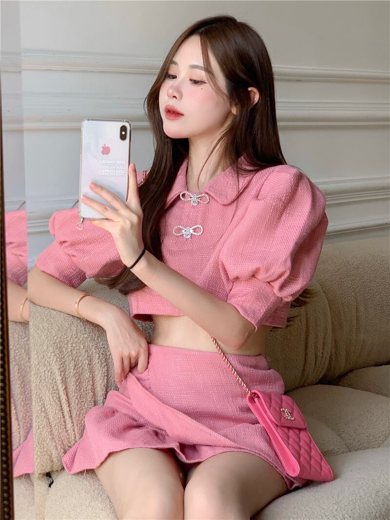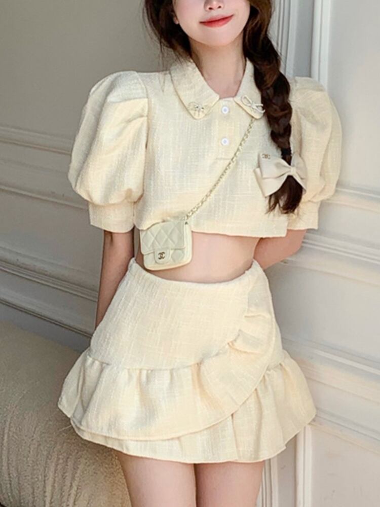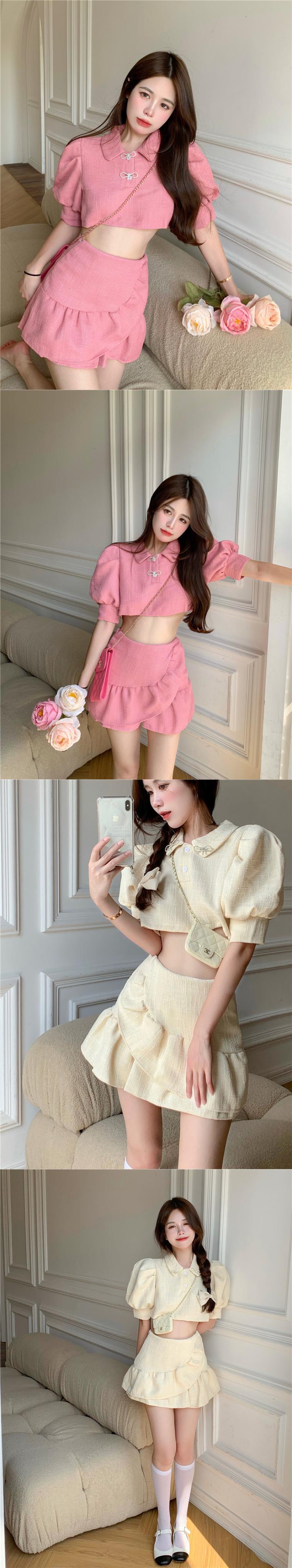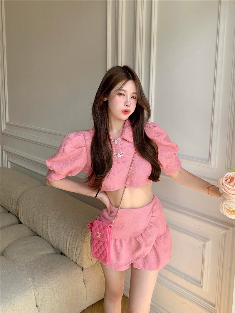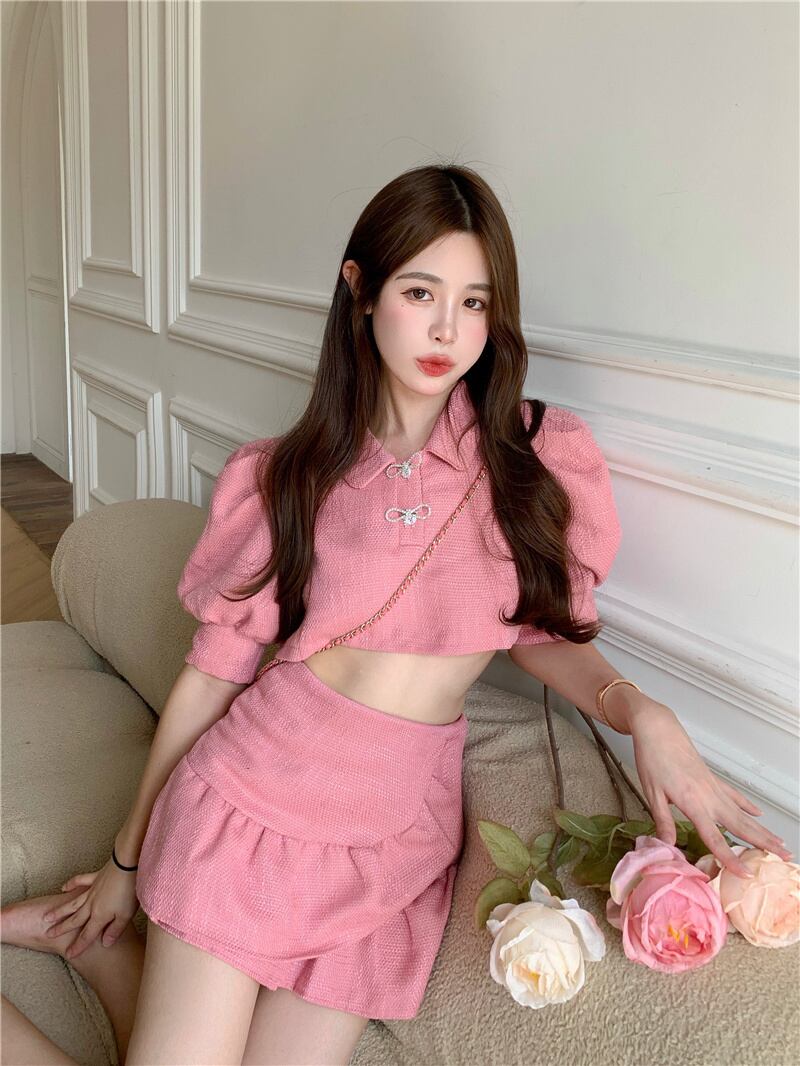 小さな香りのスーツ夏甘いツイード 2 点セット女性パフスリーブクロップトップ + マーメイドスカートセットスカートスーツ 大人ガーリー スウィート キュート カジュアル サマー 夏物 mes23560730750