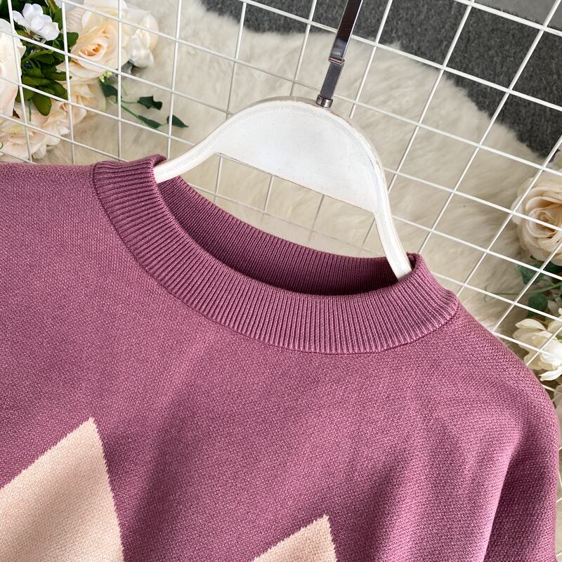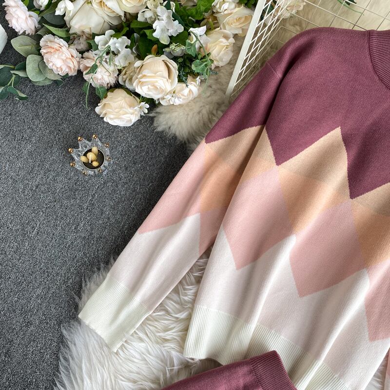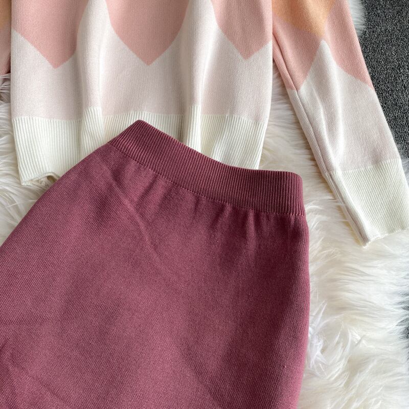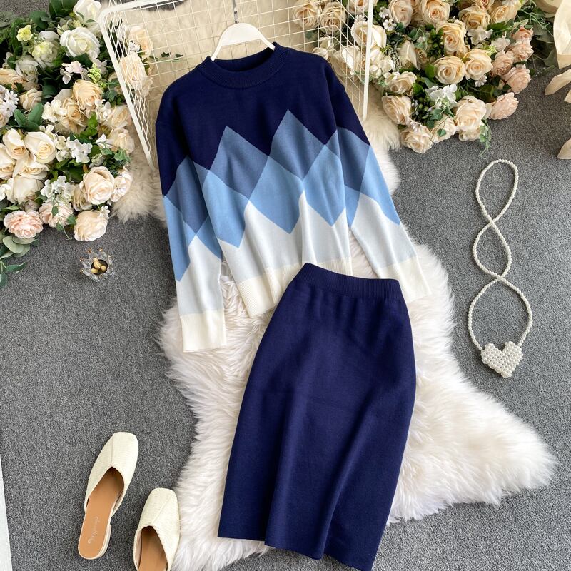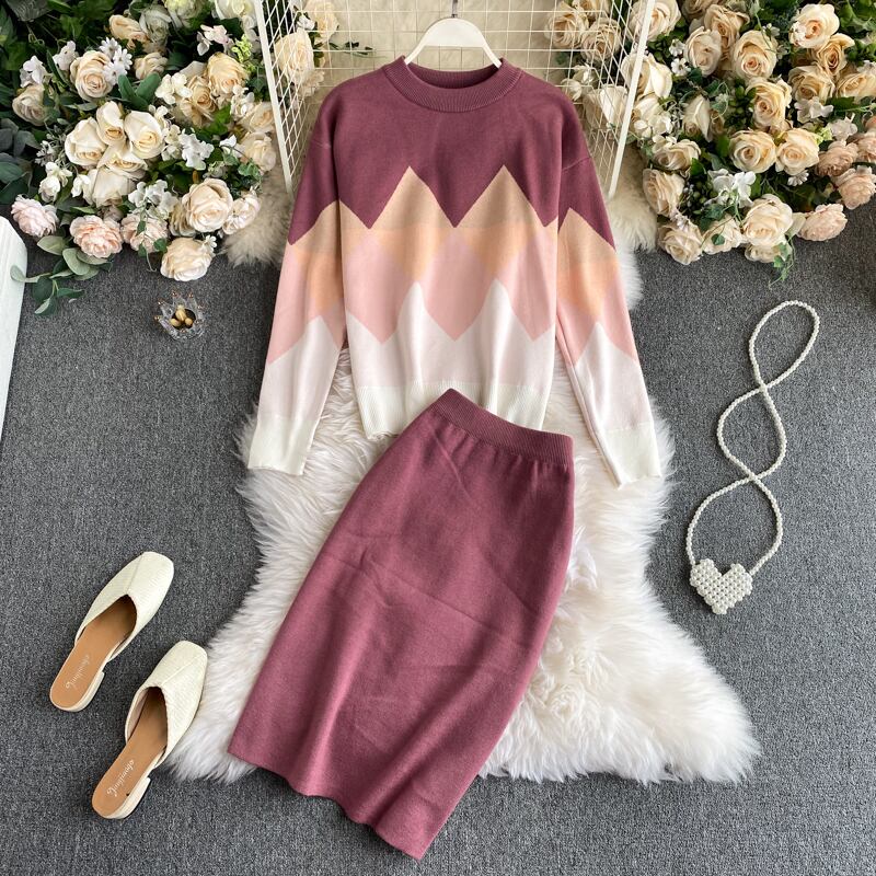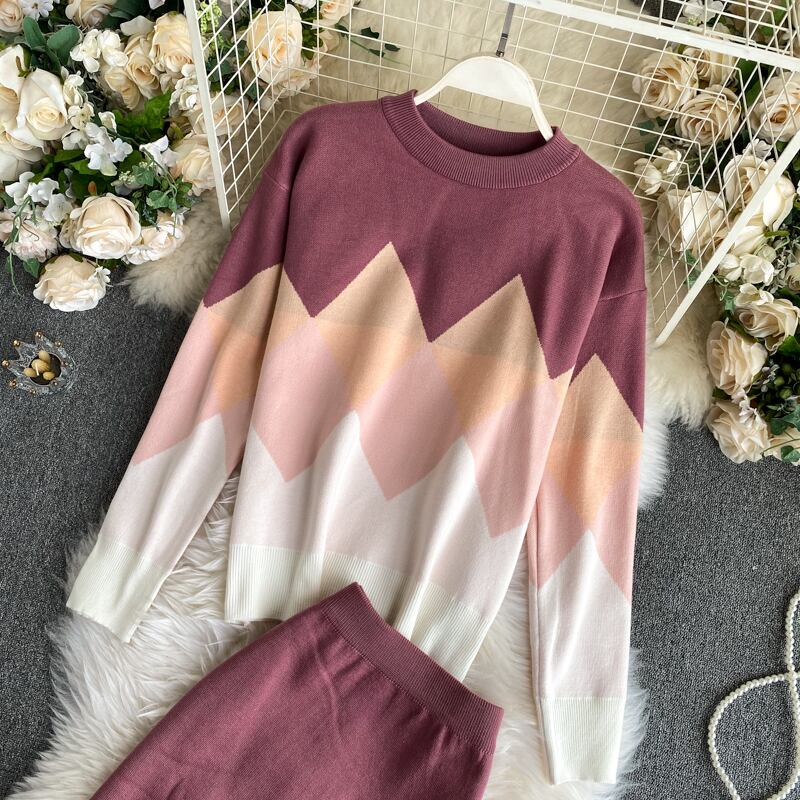 女性のニットセット春 O ネック幾何学淡いルーズプルオーバーセータートップスとロングペンシルスカート 2 点セット スプリング 春物 Oネック mes99778294502