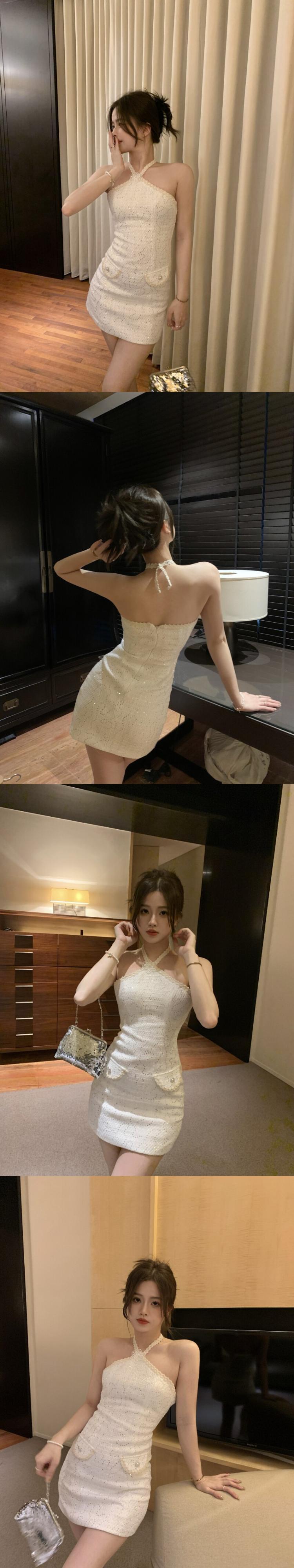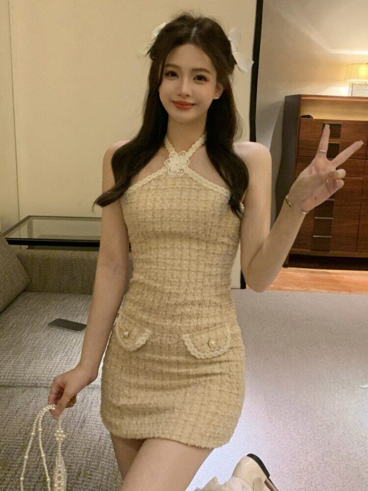 Hotsweet小さな香りツイードドレス女性ホルターセクシーなボディコンサマードレスミニパーティーローブvestido 大人ガーリー スウィート キュート カジュアル 夏物 mes32209852342
